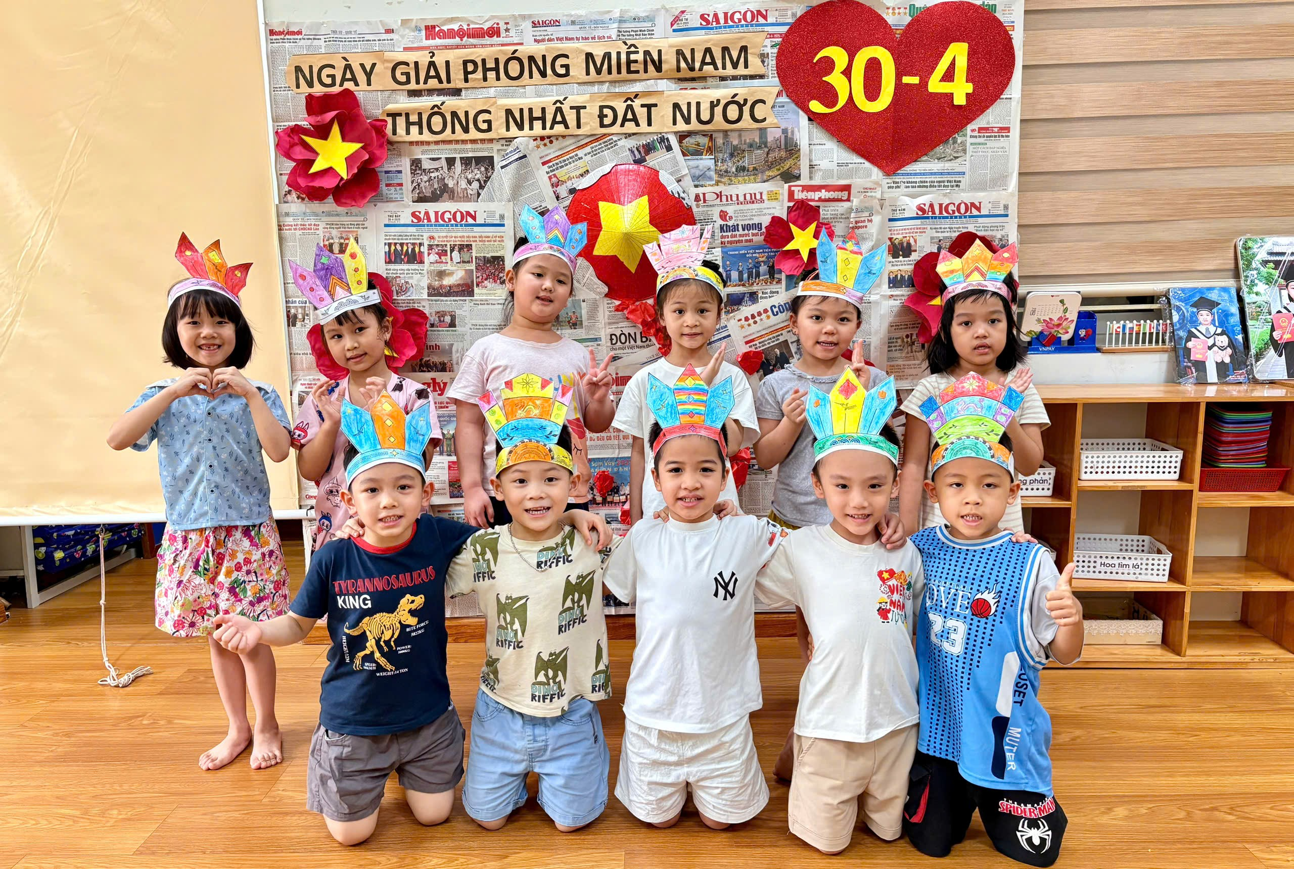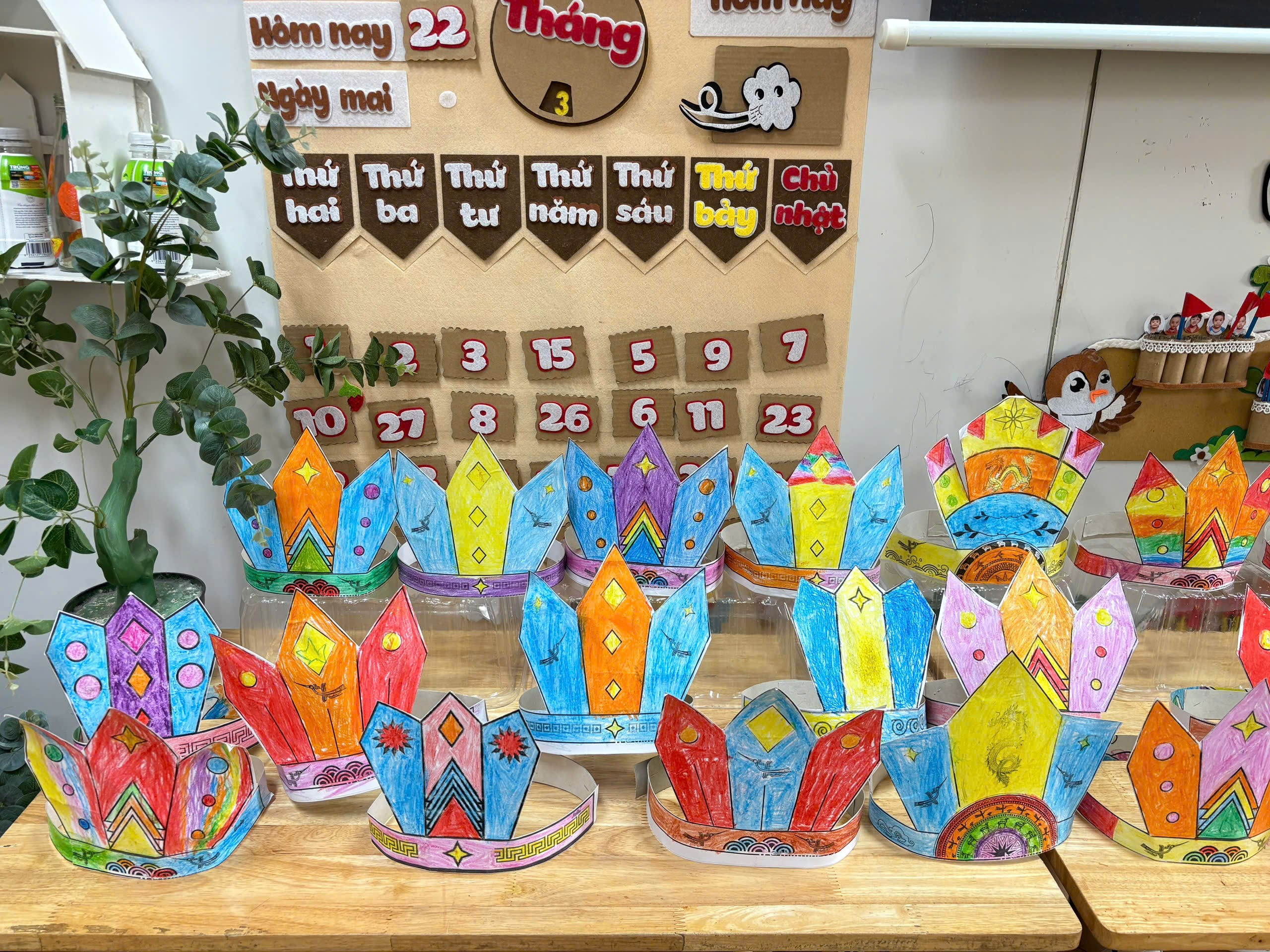Sau khi hoàn thành phần tô màu, cô giáo dán lên bìa và cắt theo đường viền để tạo thành chiếc mũ hoàn chỉnh, những chiếc mũ được “ra đời” đầy màu sắc, sáng tạo và mang dấu ấn riêng của mỗi bé. Khi đội lên đầu, bé nào cũng rạng rỡ, tự hào như những “Vua Hùng nhí” đáng yêu.