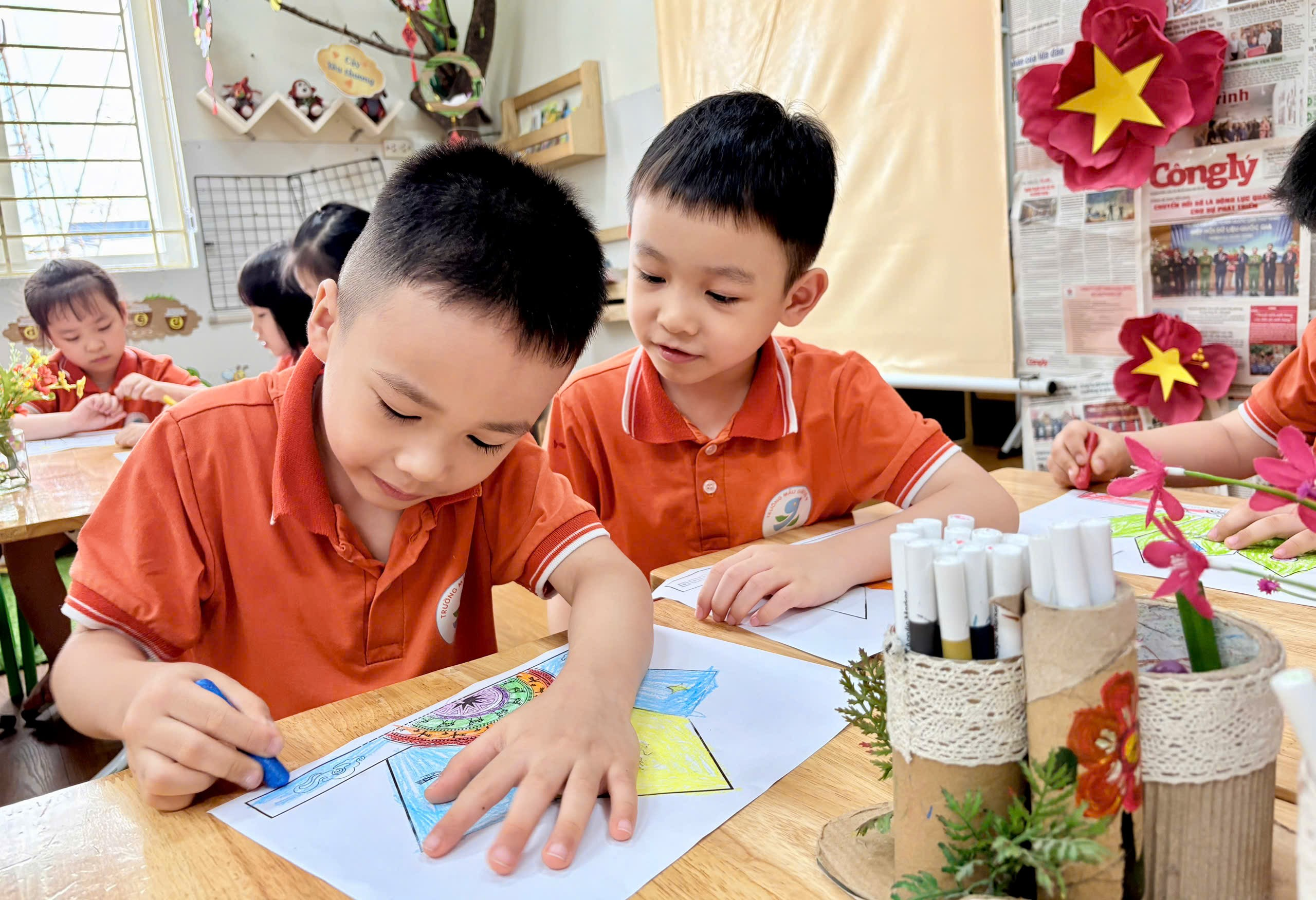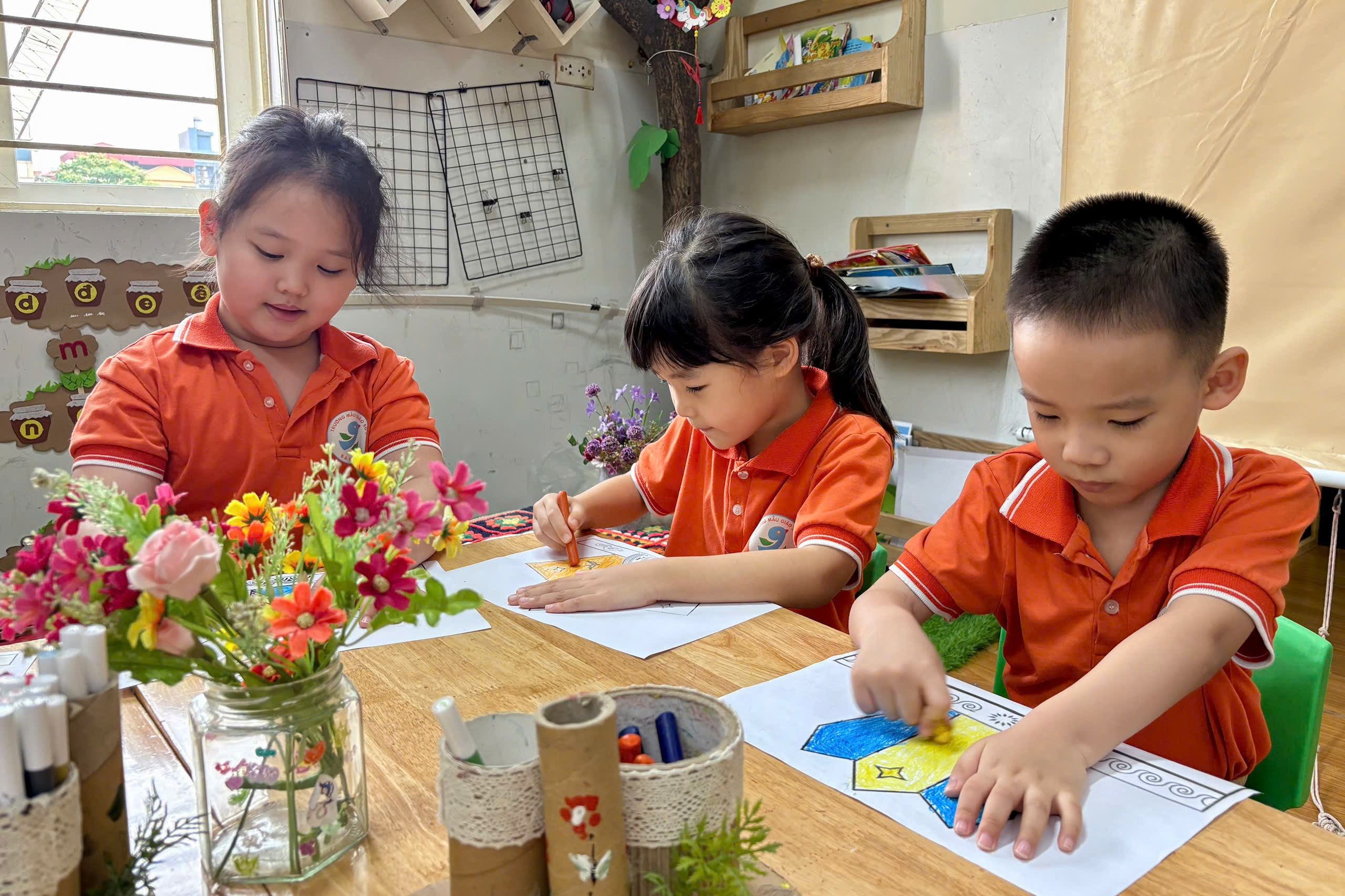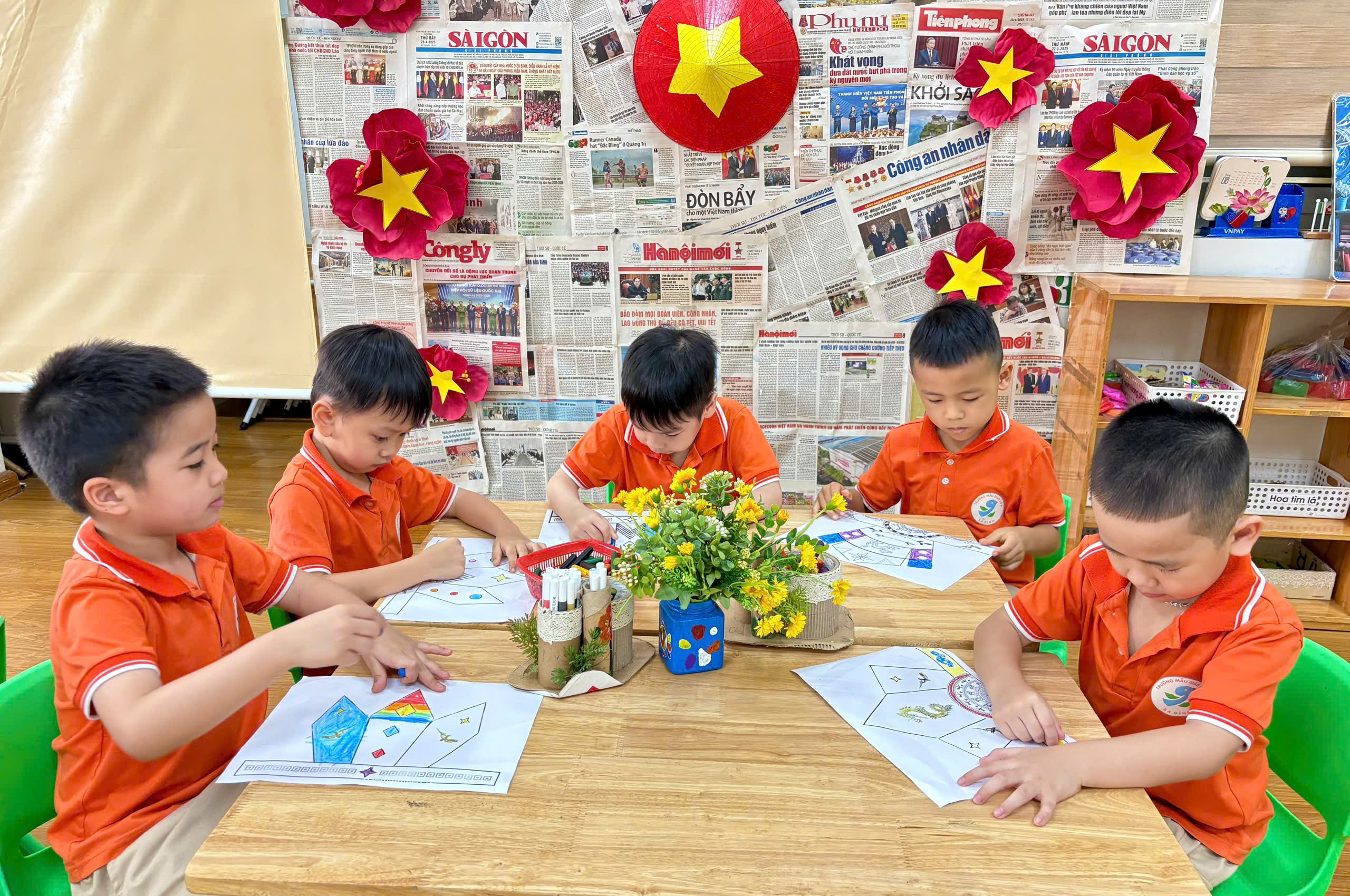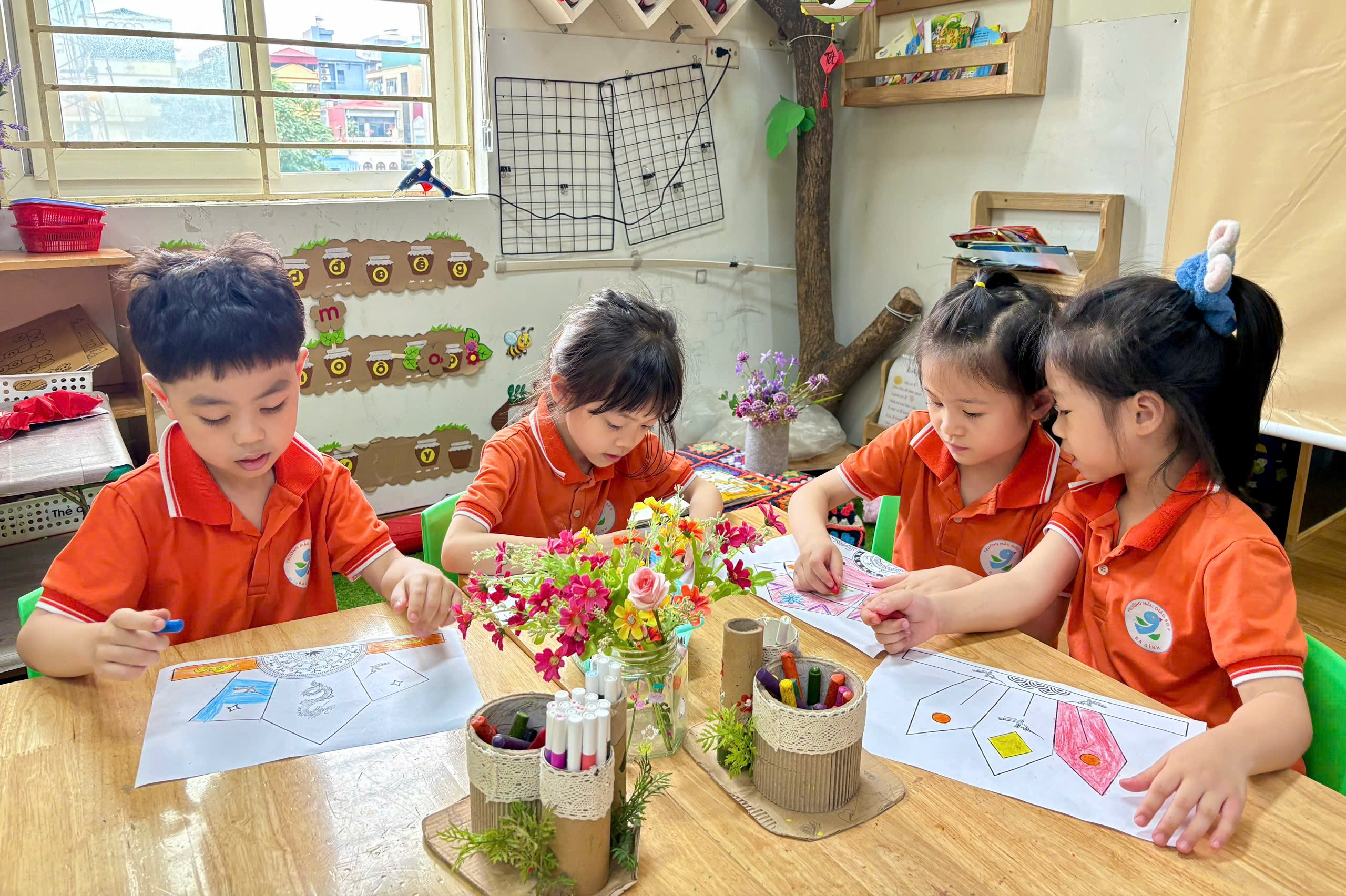 Trong hoạt động, cô giáo đã chuẩn bị sẵn các hình ảnh mũ Vua Hùng để bé tô màu. Với những đôi tay nhỏ xinh nhưng vô cùng khéo léo, các bé đã lựa chọn màu sắc yêu thích, tỉ mỉ tô từng chi tiết như ngôi sao, hoa văn trang trí. Không khí lớp học trở nên sôi nổi khi các bé cùng nhau trao đổi, chia sẻ màu sắc và giúp đỡ bạn bè.