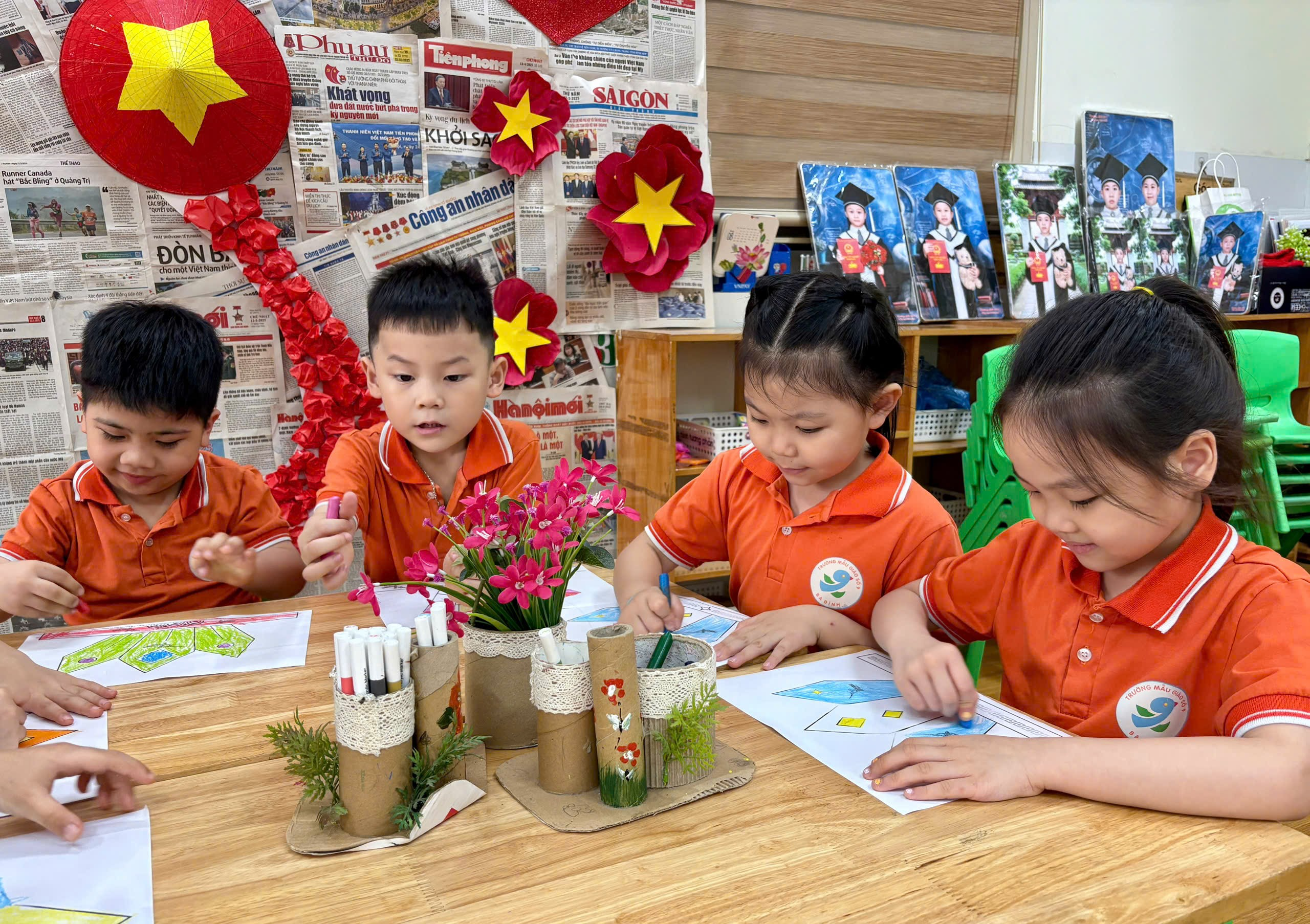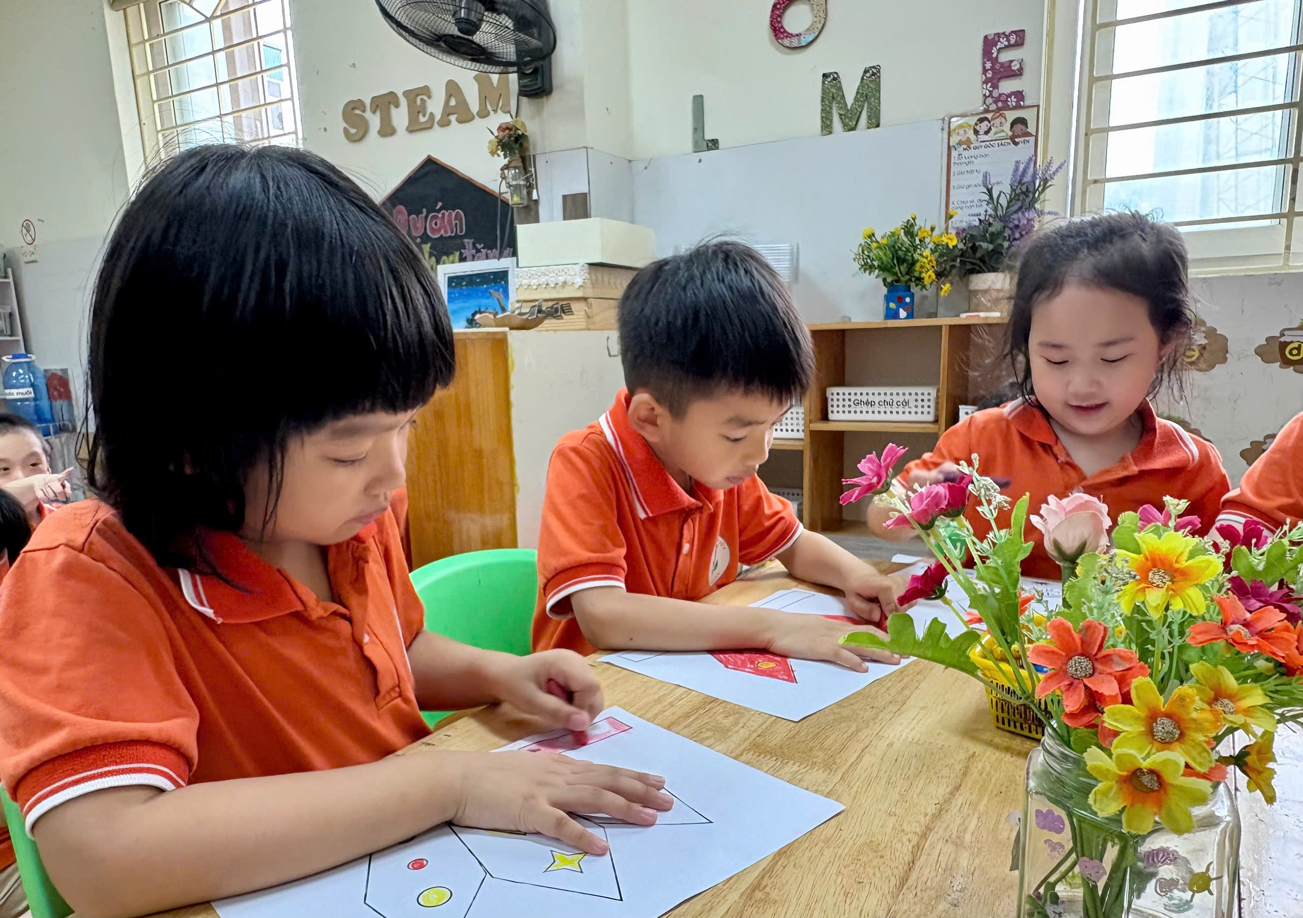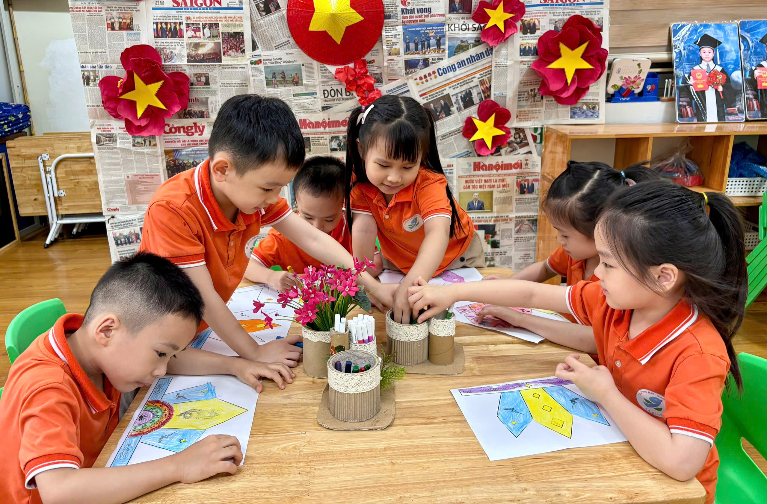 Trong hoạt động, cô giáo đã chuẩn bị sẵn các hình ảnh mũ Vua Hùng để bé tô màu. Với những đôi tay nhỏ xinh nhưng vô cùng khéo léo, các bé đã lựa chọn màu sắc yêu thích, tỉ mỉ tô từng chi tiết như ngôi sao, hoa văn trang trí. Không khí lớp học trở nên sôi nổi khi các bé cùng nhau trao đổi, chia sẻ màu sắc và giúp đỡ bạn bè.