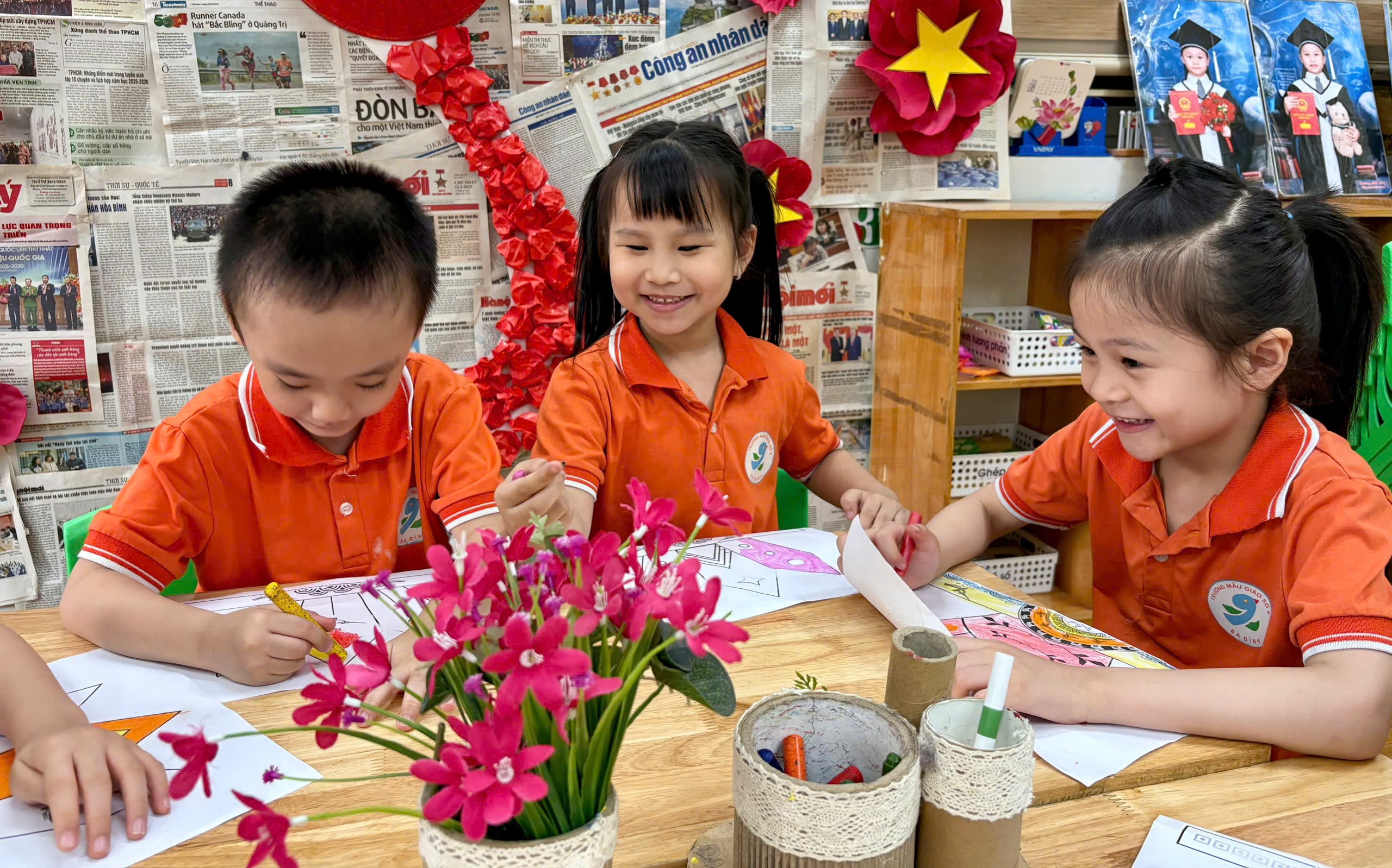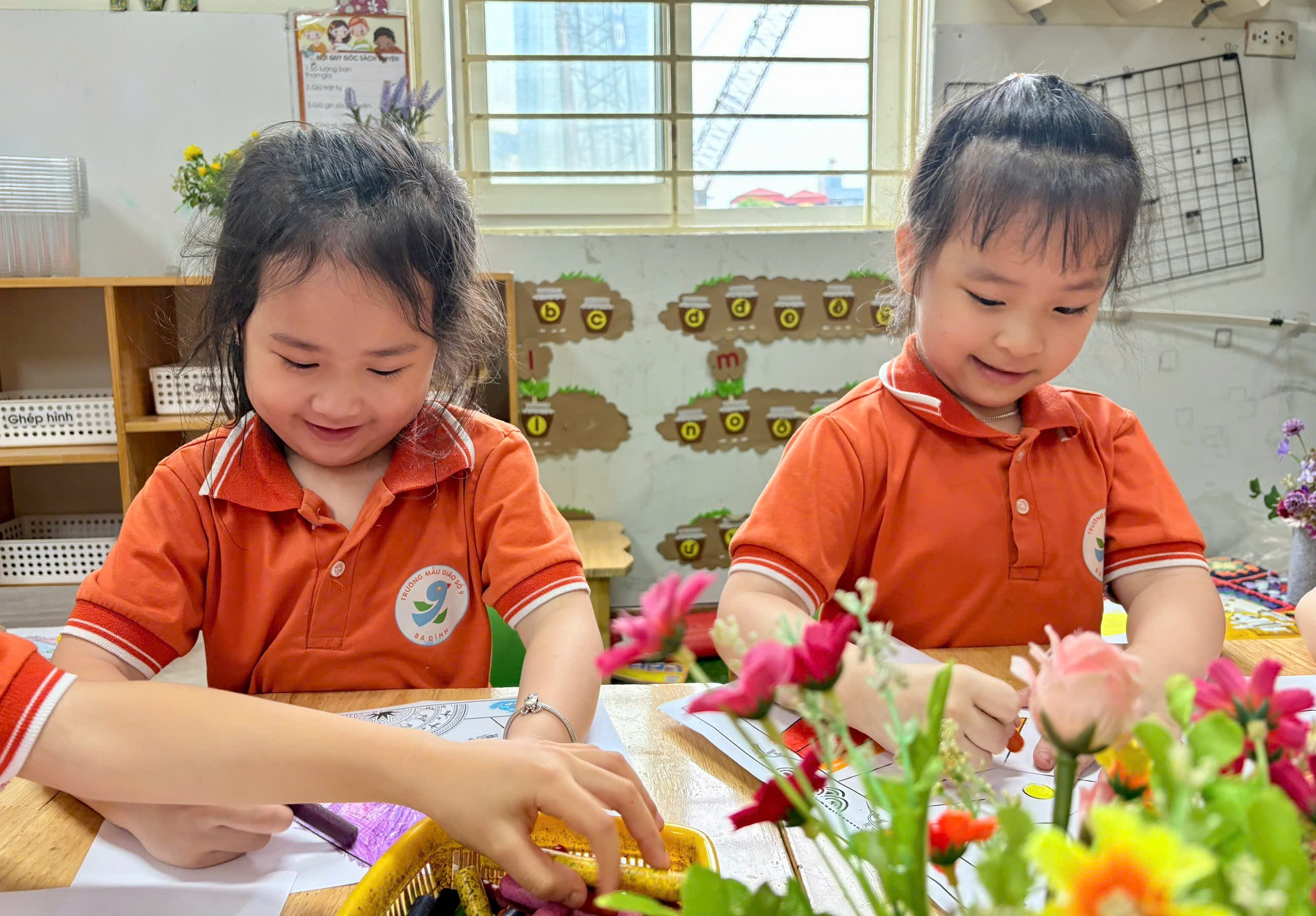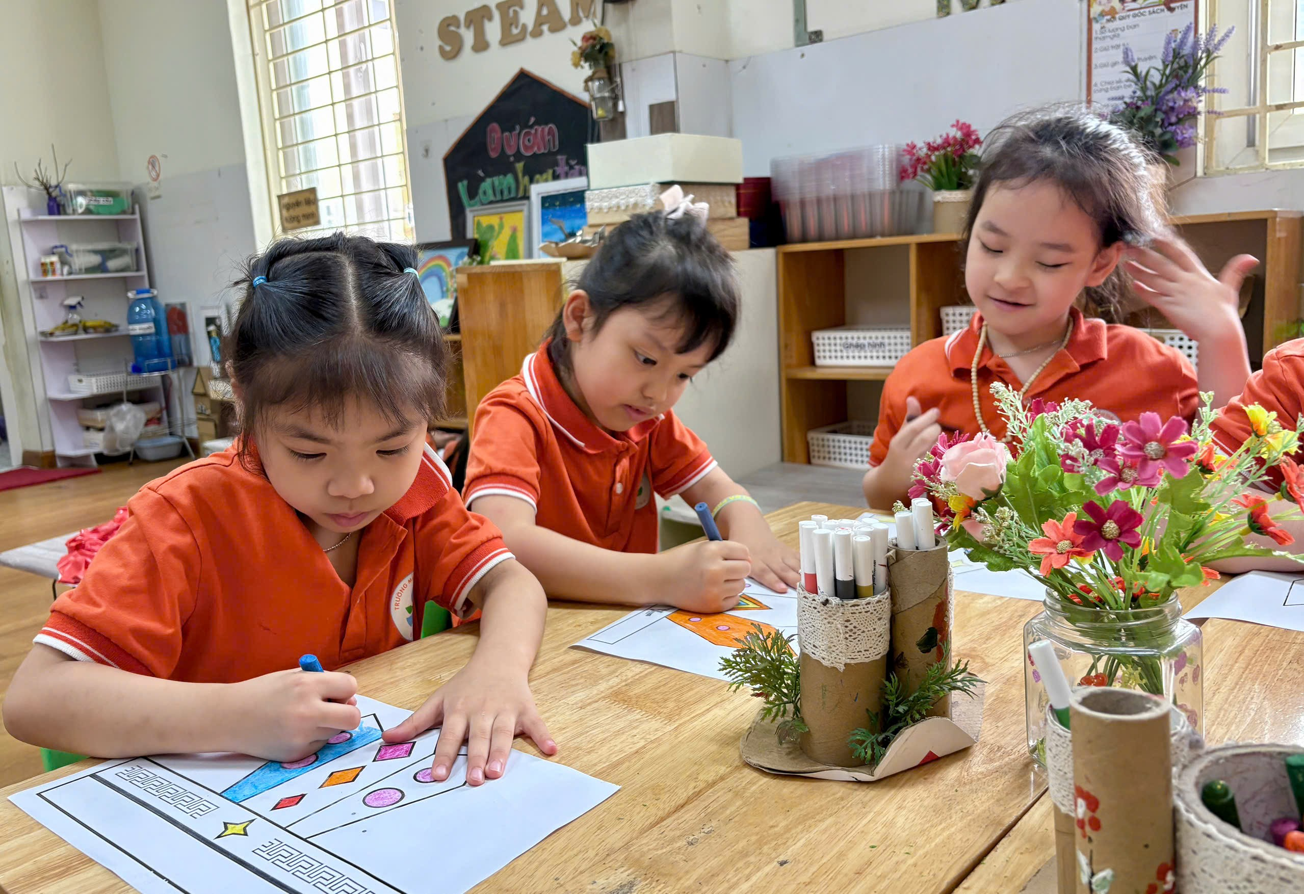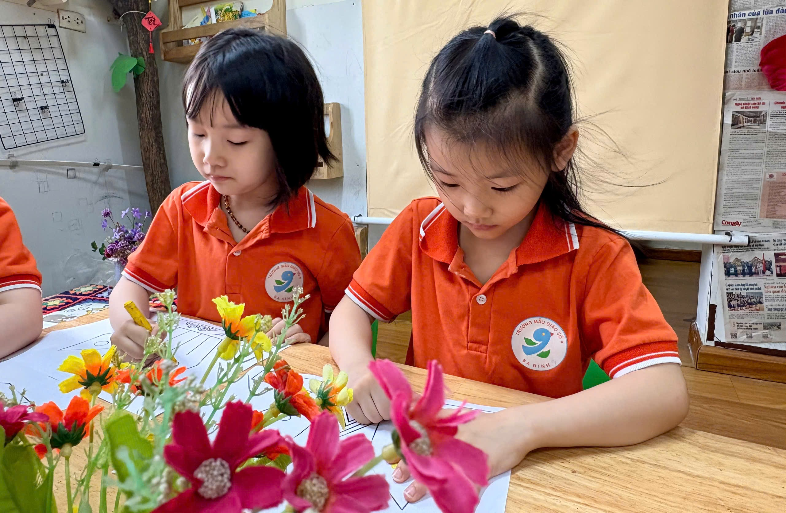 Trong hoạt động, cô giáo đã chuẩn bị sẵn các hình ảnh mũ Vua Hùng để bé tô màu. Với những đôi tay nhỏ xinh nhưng vô cùng khéo léo, các bé đã lựa chọn màu sắc yêu thích, tỉ mỉ tô từng chi tiết như ngôi sao, hoa văn trang trí. Không khí lớp học trở nên sôi nổi khi các bé cùng nhau trao đổi, chia sẻ màu sắc và giúp đỡ bạn bè.