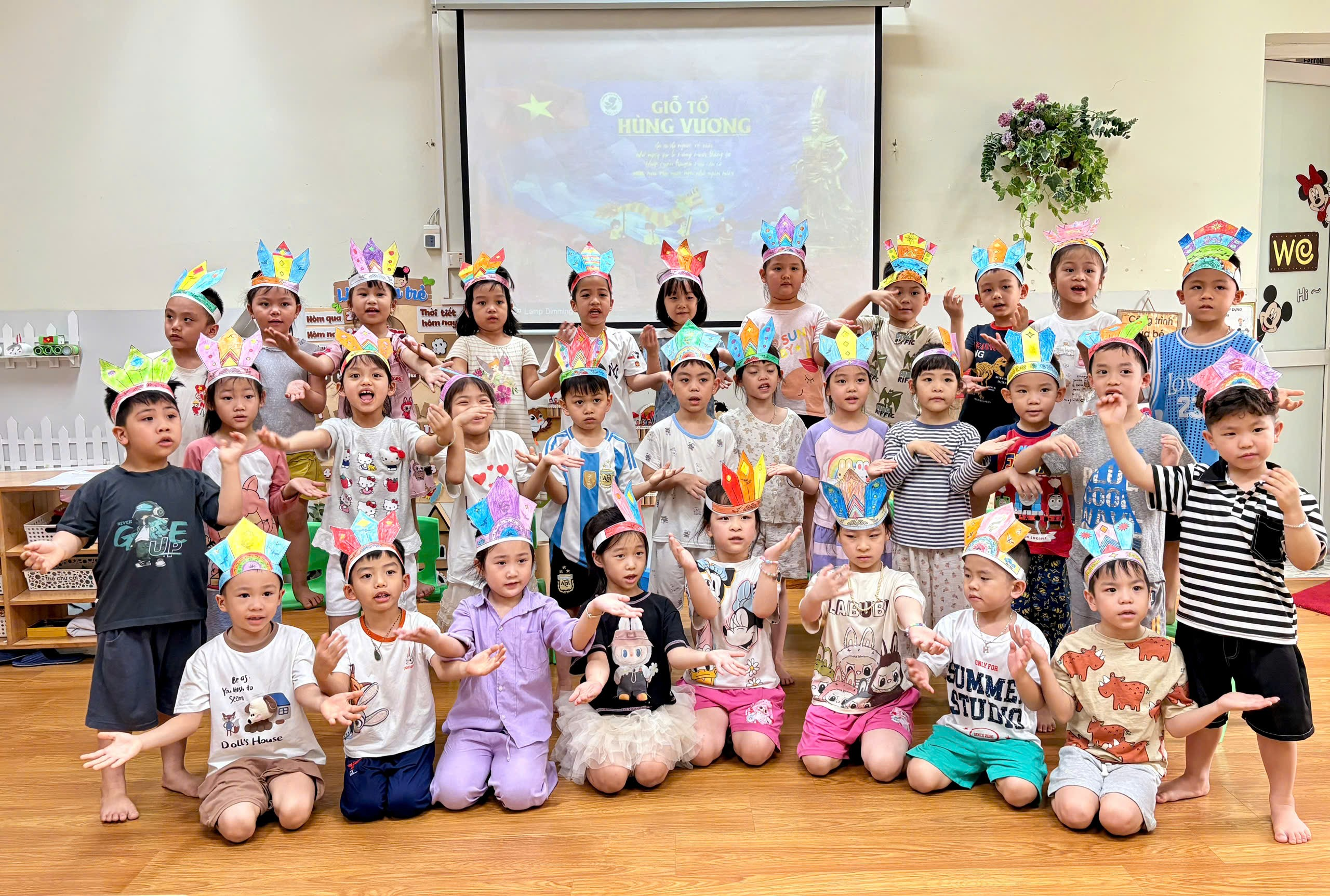 Ngay từ đầu giờ học, các bé đã rất hào hứng khi được cô giáo giới thiệu về ý nghĩa của chiếc mũ Vua Hùng – biểu tượng gắn liền với thời đại dựng nước đầu tiên của dân tộc. Qua đó, bé hiểu thêm về truyền thống “Uống nước nhớ nguồn” và lòng tự hào dân tộc.