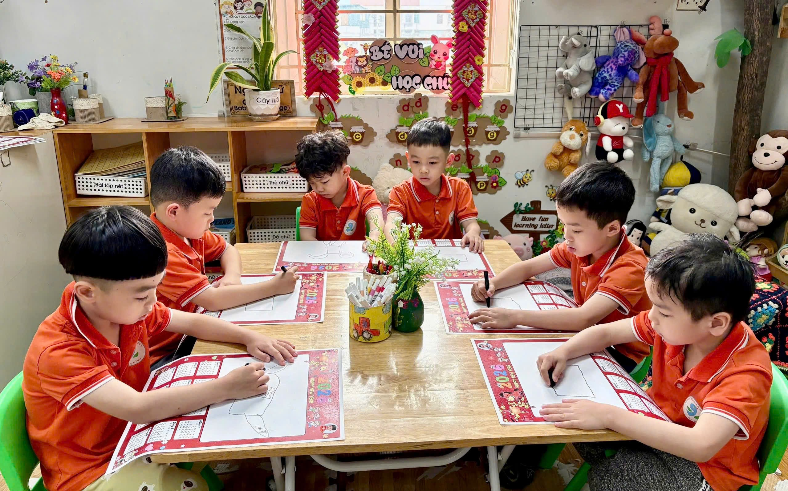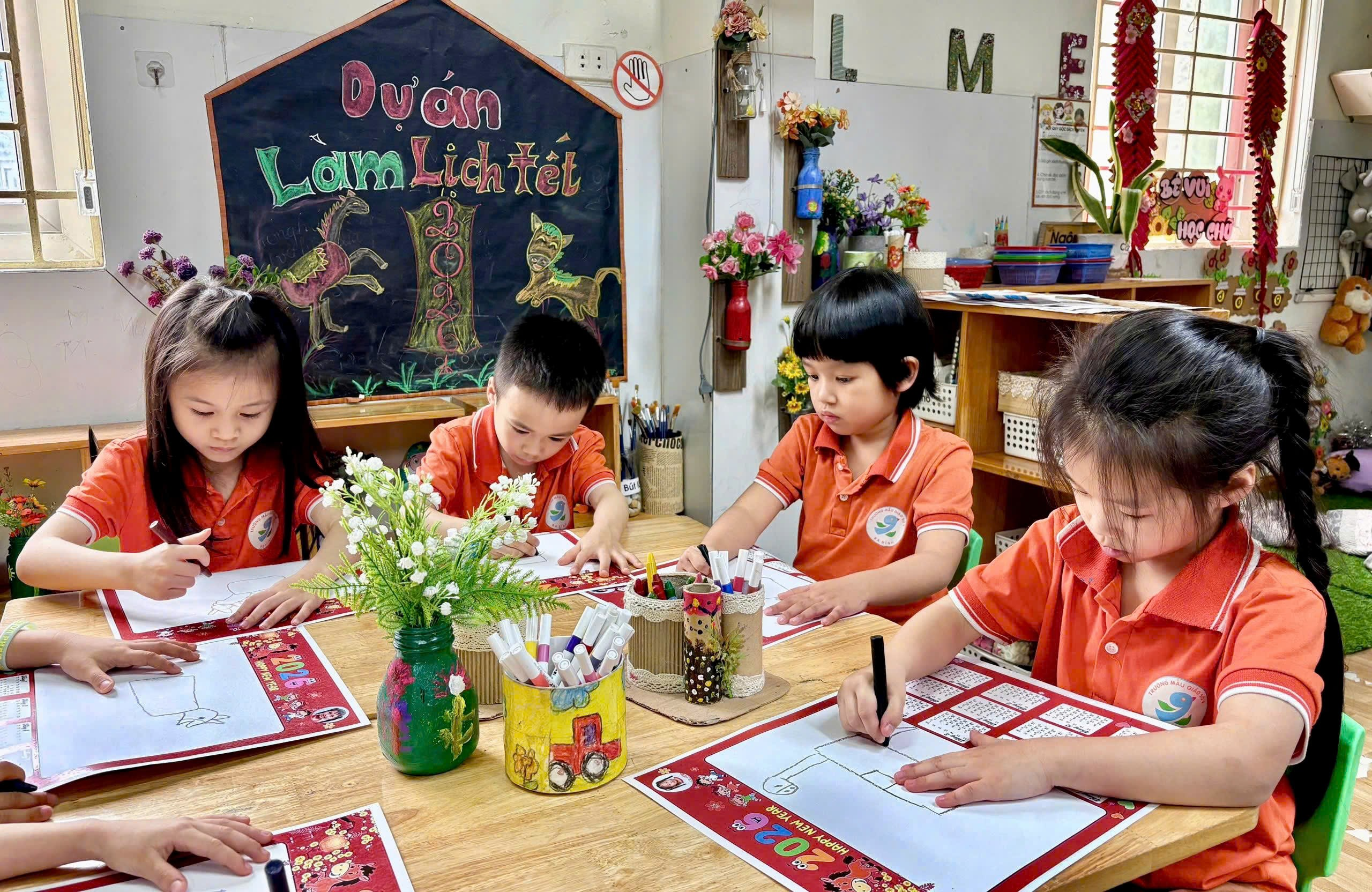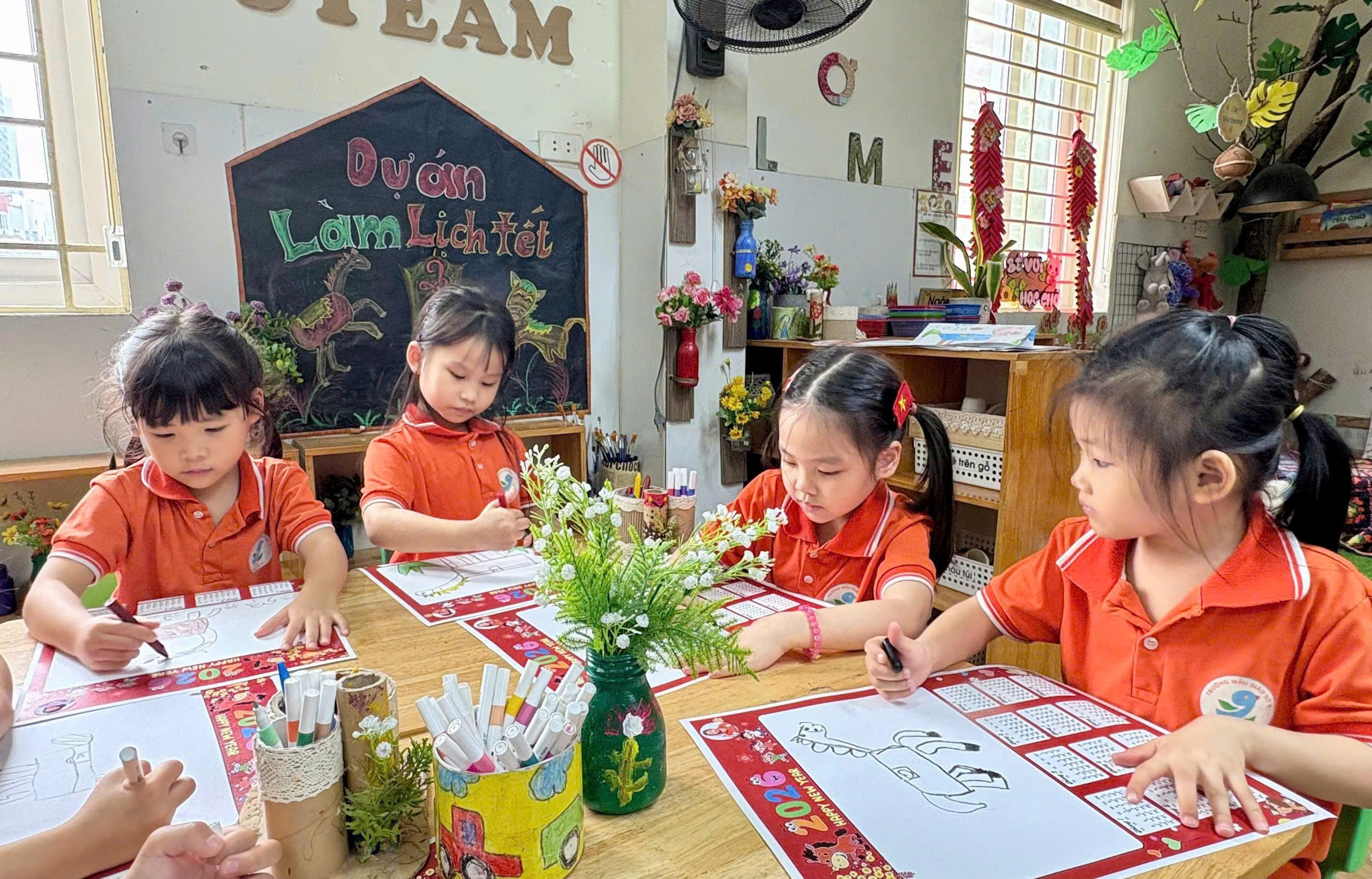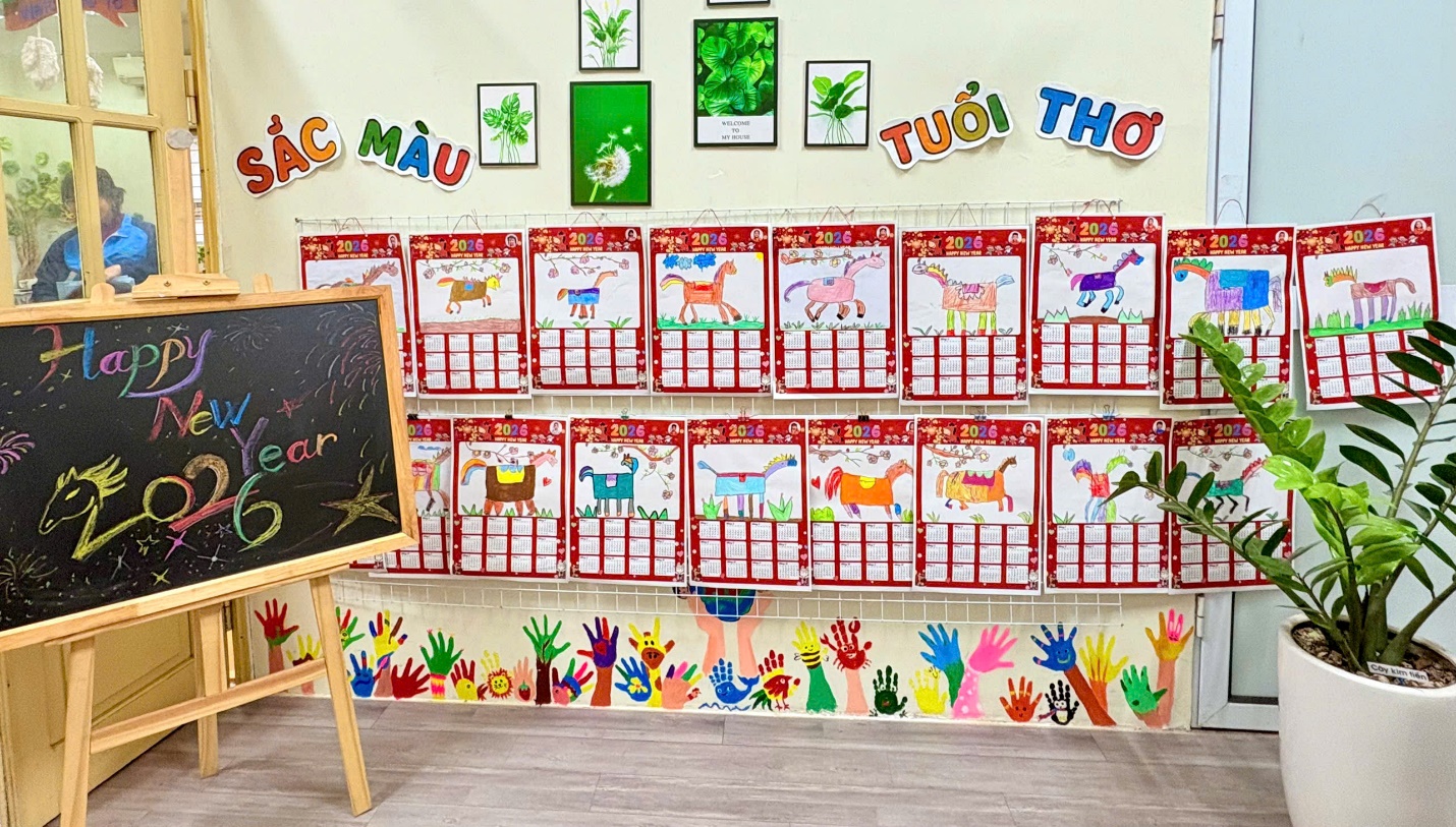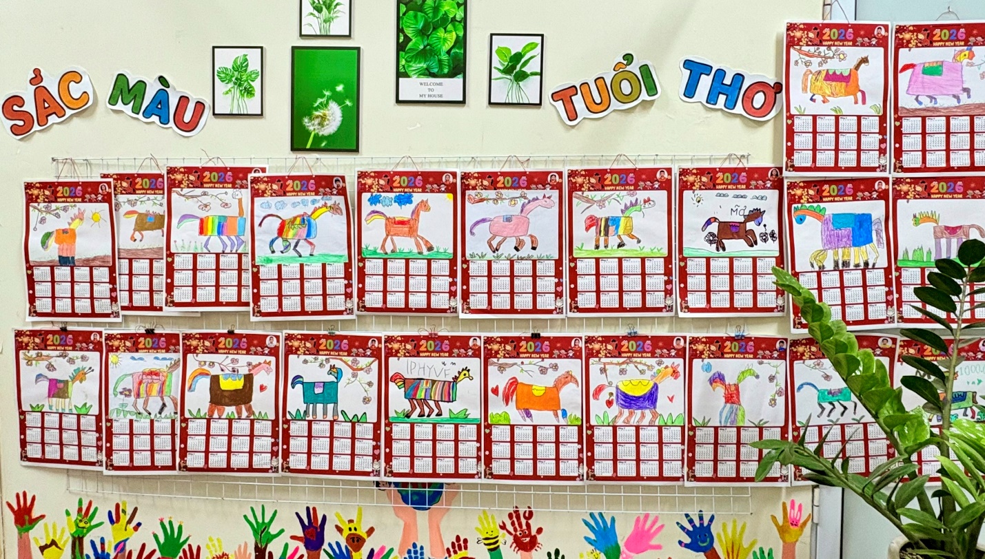 Từ những tờ lịch 2 tháng, năm 2026 do cô giáo chuẩn bị và in màu sẵn, các bé được quan sát bố cục lịch, sau đó thỏa sức vẽ và tô màu những chú ngựa – biểu tượng của năm mới theo trí tưởng tượng phong phú của mình. Mỗi sản phẩm là một tờ lịch nhỏ xinh, mang đậm nét vẽ hồn nhiên, đáng yêu của bé.