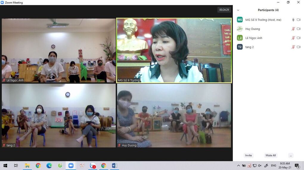 Để hoàn thành kế hoạch năm học và tổng kết công tác năm học 2020-2021, Trường mẫu giáo Số 9 đã tổ chức họp toàn bộ cán bộ, giáo viên, nhân viên của trường bằng hình thức họp trực tuyến trên Zoom thông qua 04 phòng họp tại trường nhằm đảm bảo số lượng người tham dự trực tiếp theo đúng quy định giãn cách của công tác phòng dịch Covid-19.