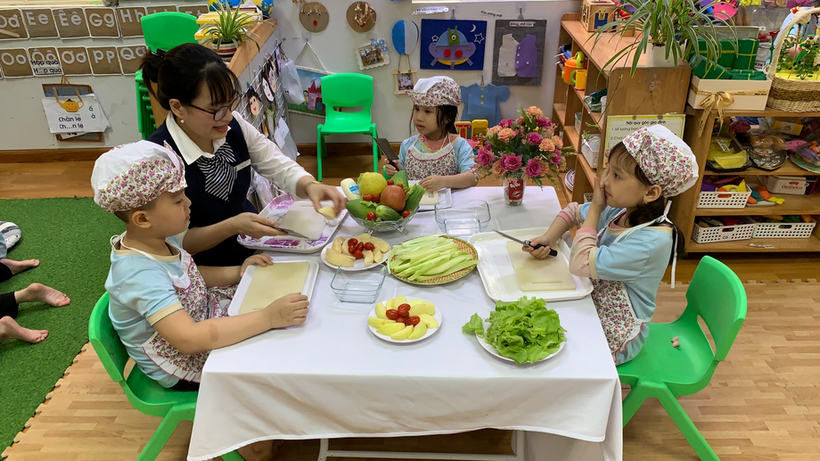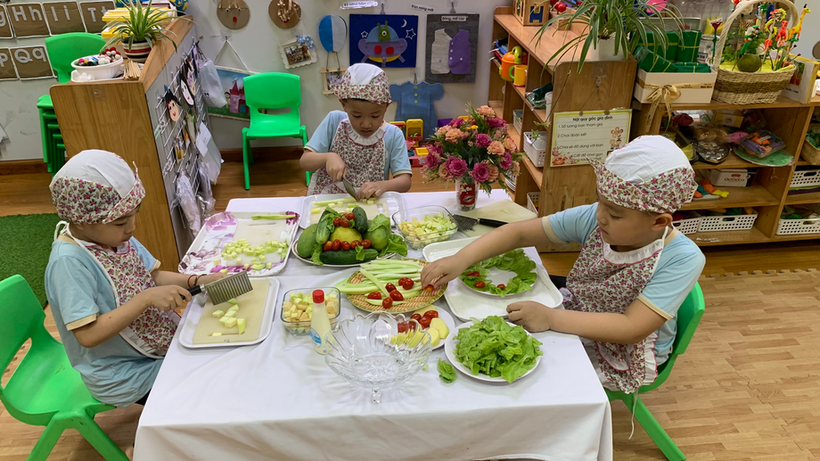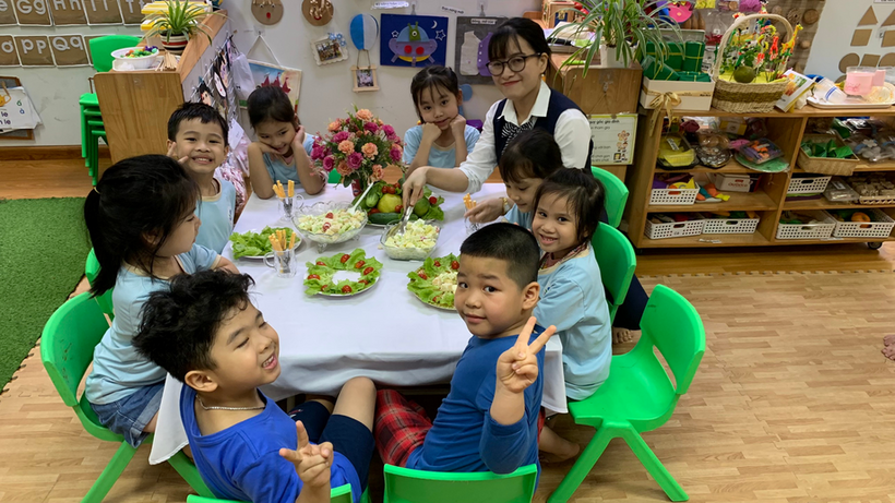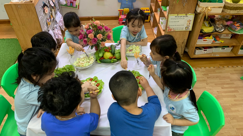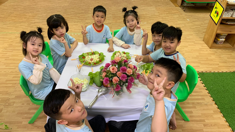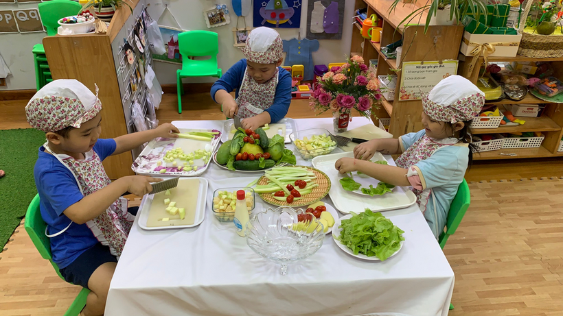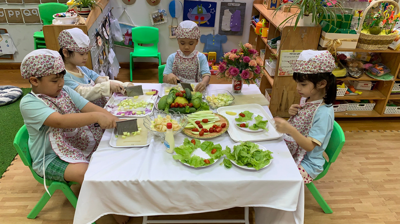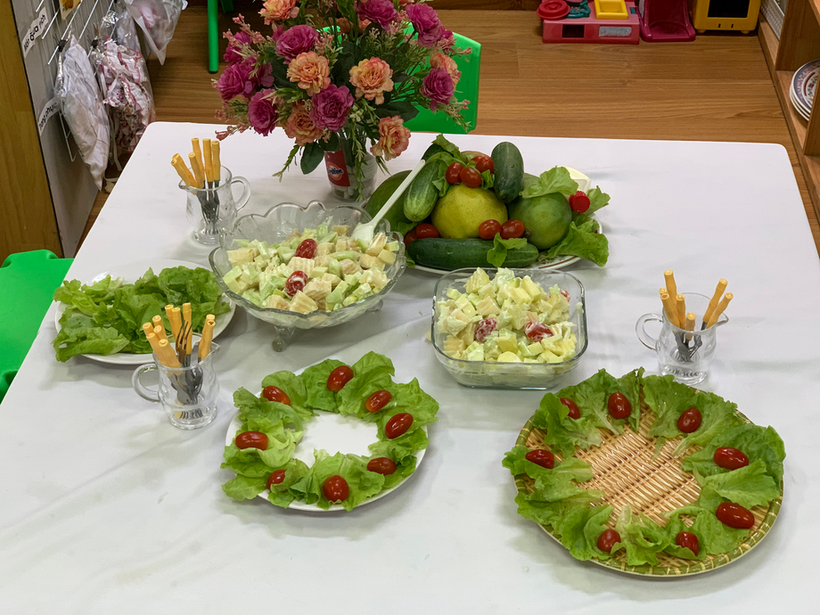 Hãy cùng các bé lớp mẫu giáo lớn A1 thỏa sức đam mê chế biến món Salad hoa quả trộn nào!