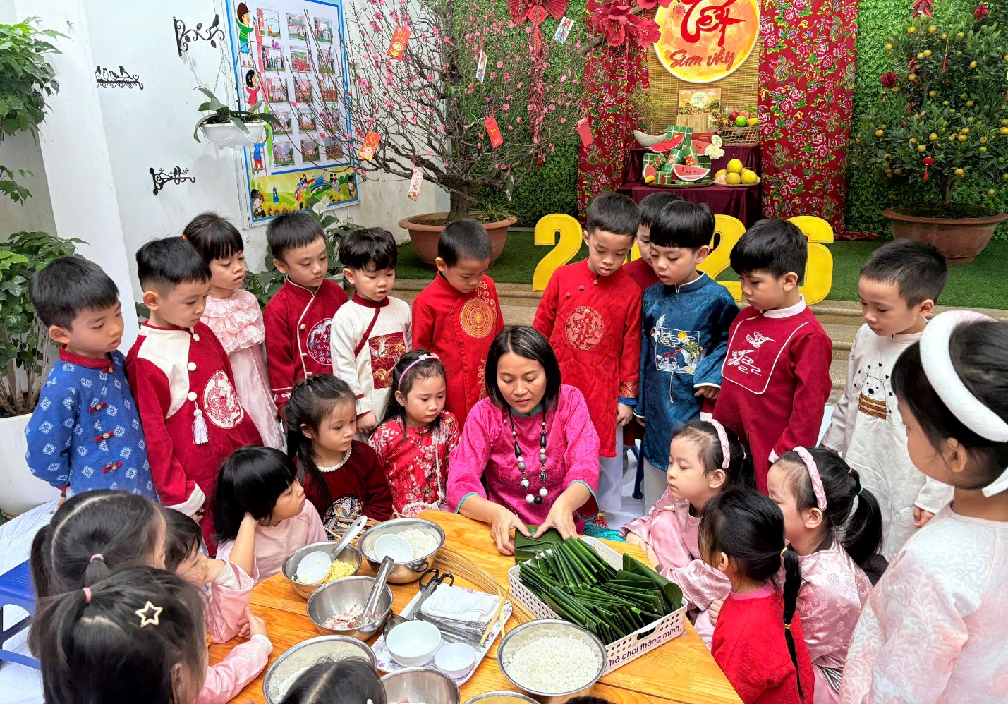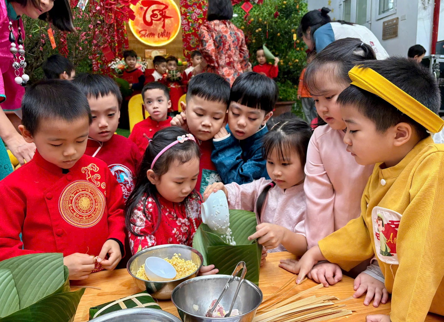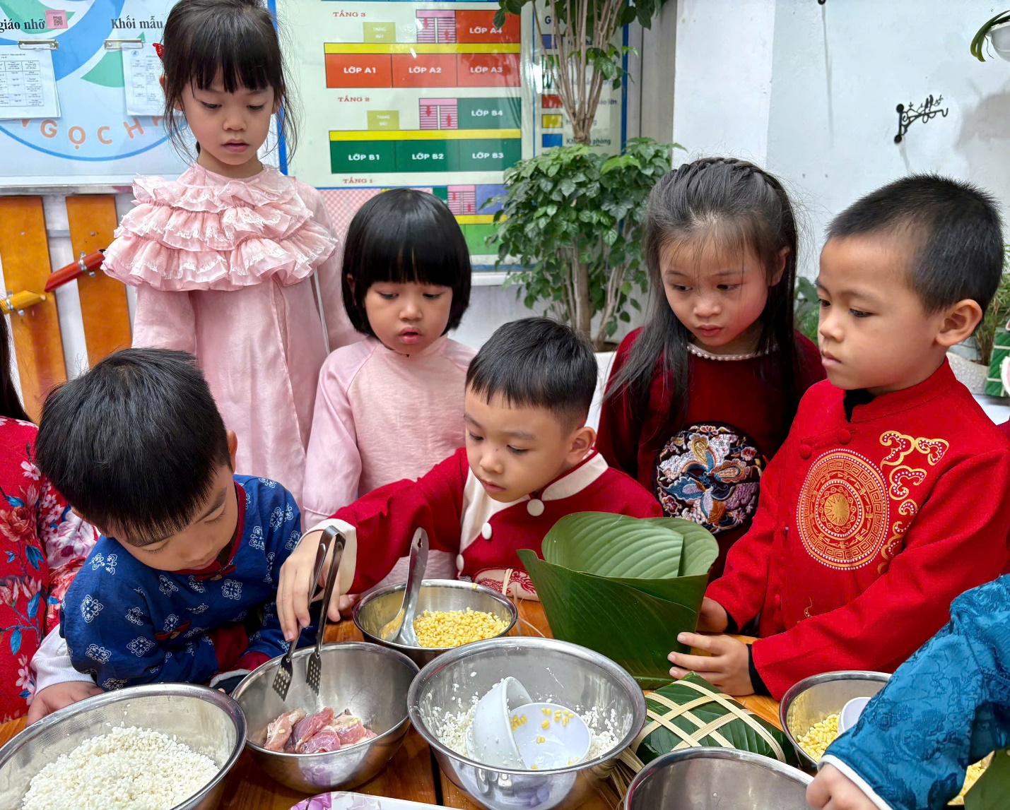 Lễ hội bánh chưng – Bé trải nghiệm Tết xưa. Các bé được cùng cô tìm hiểu về chiếc bánh chưng – món bánh quen thuộc ngày Tết cổ truyền. Từ việc quan sát lá dong, gạo nếp, đậu xanh, các bé được trực tiếp tham gia trải nghiệm gói bánh chưng cùng cô giáo. Qua hoạt động này, các con hiểu thêm về ý nghĩa của bánh chưng ngày Tết, biết trân trọng nét đẹp truyền thống và thêm yêu không khí sum vầy của ngày xuân.