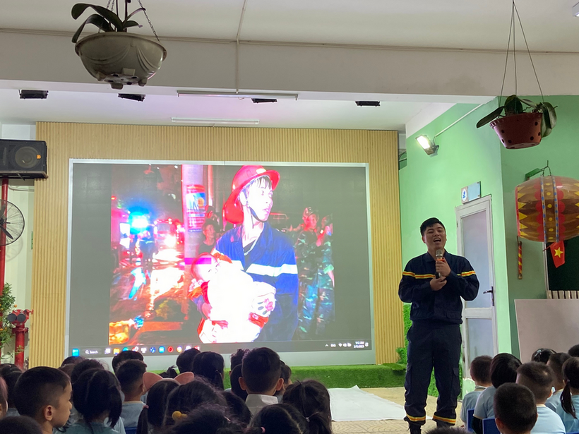 Các con hào hứng khi được giao lưu tìm hiểu, thực hành cách xử lí tình huống thoát hiểm khi có cháy. Cuối buổi, các cán bộ, giáo viên trong toàn trường cùng tham gia diễn tập phương án xử lý PCCC