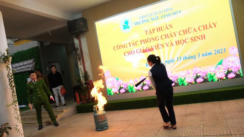 Thực hiện kế hoạch nhiệm vụ năm học, để thực hiện tốt công tác PCCC, cứu hộ cứu nạn trong nhà trường và nâng cao hơn nữa nhận thức, vai trò, trách nhiệm về công tác PCCC cho mỗi cán bộ, giáo viên, nhân viên, ngày 15/3/2023, trường Mẫu giáo Số 9 đã phối hợp với Trung tâm bồi dưỡng kỹ năng phòng vệ thông minh cùng Đội PCCC Công an quận Ba Đình tổ chức tập huấn chuyên đề “Công tác phòng cháy chữa cháy – cứu hộ cứu nạn cho giáo viên và học sinh”.