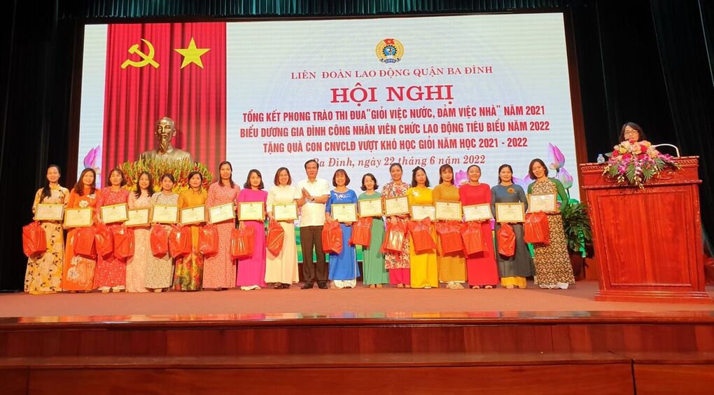 Hội nghị tổng kết phong trào thi đua “Giỏi việc nước, đảm việc nhà” năm 2021, biểu dương gia đình CNVCLĐ tiêu biểu năm 2022 do Liên đoàn lao động Quận Ba Đình tổ chức đã biểu dương, tôn vinh và nhân rộng các gương điển hình CNVCLĐ tiêu biểu cũng như động viên CNVCLĐ tích cực tham gia các phong trào thi đua góp phần xây dựng phong trào CNVCLĐ và hoạt động Công đoàn các cấp ngày càng vững mạnh.