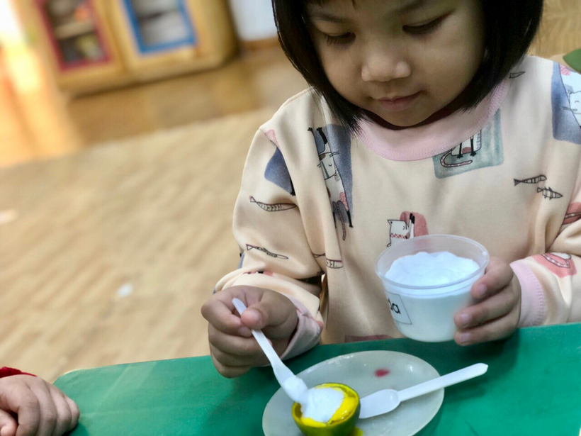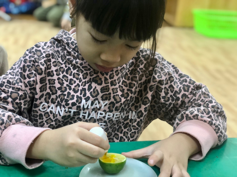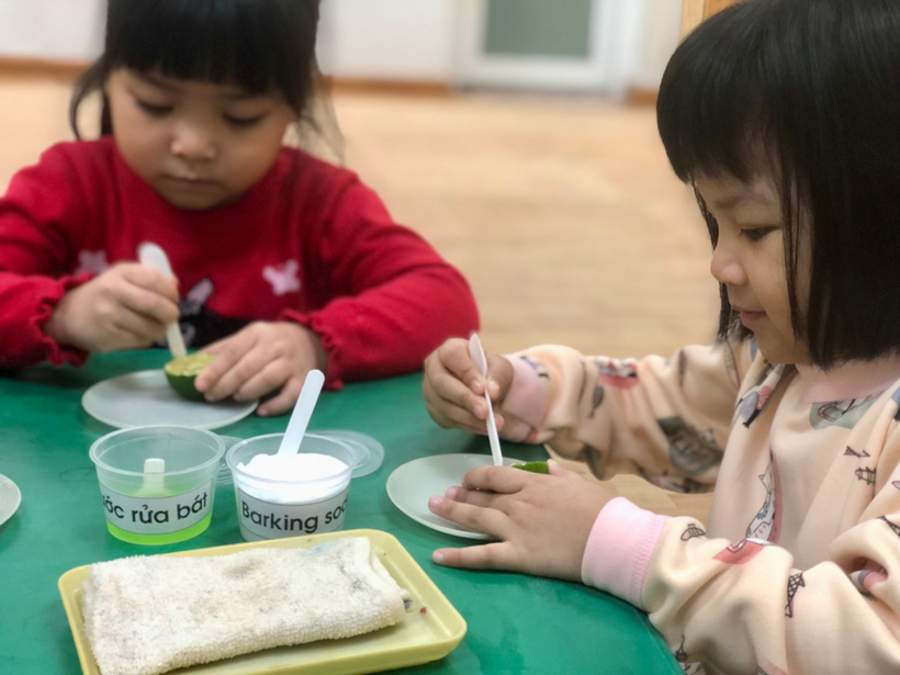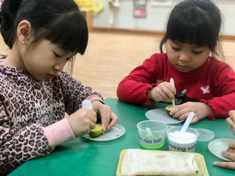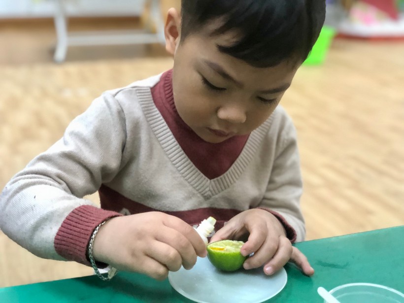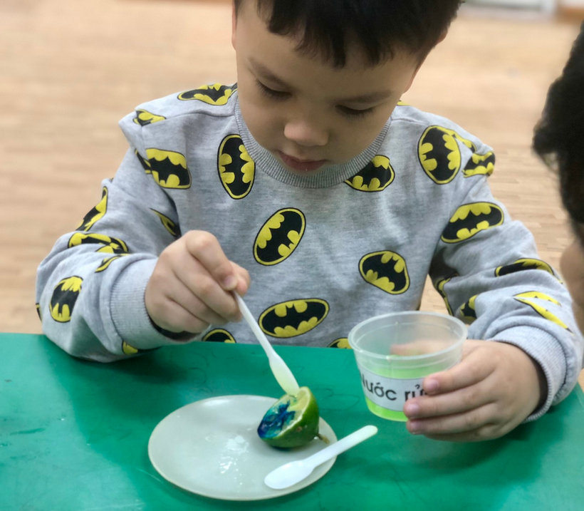 Để giúp trẻ khám phá thế giới xung quanh, kích thích sự tìm tòi khám phá, khả năng tư duy sáng tạo, các cô giáo lớp MGL A2 đã cho trẻ khám phá sự kì diệu của quả chanh bằng thí nghiệm khoa học. Thí nghiệm khoa học này đã giúp trẻ biết thêm ngoài giấm, barking soda còn có phản ứng sủi bọt khi gặp chanh, vì cùng tính axit. Quả chanh không những sủi bọt bình thường, mà còn sủi liên tục với nhiều màu sắc đẹp mắt. Do có cả nước rửa bát nên bong bóng nhiều, tràn ra cả bên ngoài quả chanh, gây hứng thú cho trẻ khi thấy thành quả của thí nghiệm.