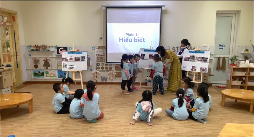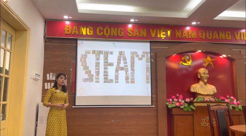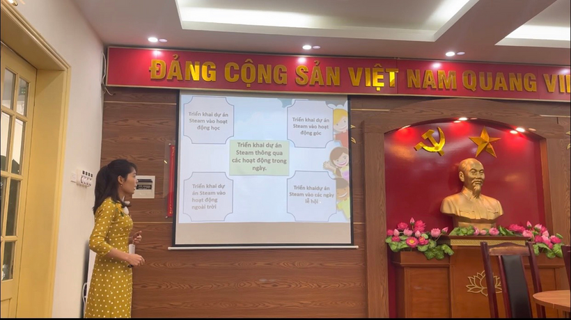Sau khi tham gia phần thực hành, cô giáo tham gia phần thuyết trình biện pháp với đề tài “Biện pháp lồng ghép giáo dục Steam cho trẻ mẫu giáo 5-6 tuổi”. Với sự tự tin, bình tĩnh trình bày, cô giáo đã xuất sắc hoàn thành bài thuyết trình của mình và thuyết phục được Ban giám khảo.