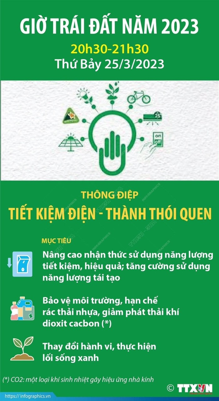 Chiến dịch này được diễn ra vào thứ Bảy cuối cùng của tháng 3 hằng năm. Và năm nay, chiến dịch Giờ trái đất với chủ đề “Tiết kiệm điện - Thành thói quen” sẽ được diễn ra vào khoảng từ 20h30 đến 21h30 ngày 25/3/2023.