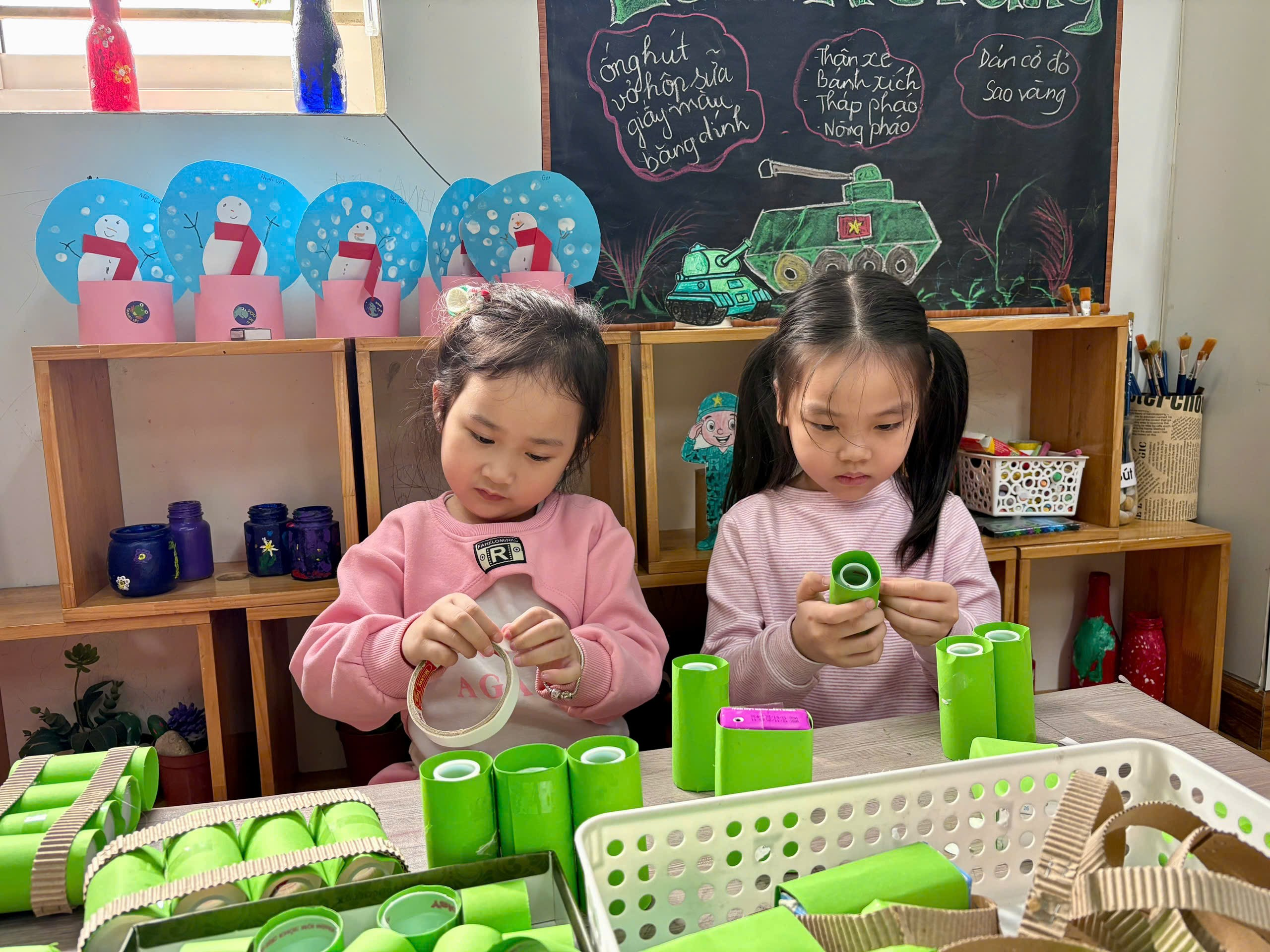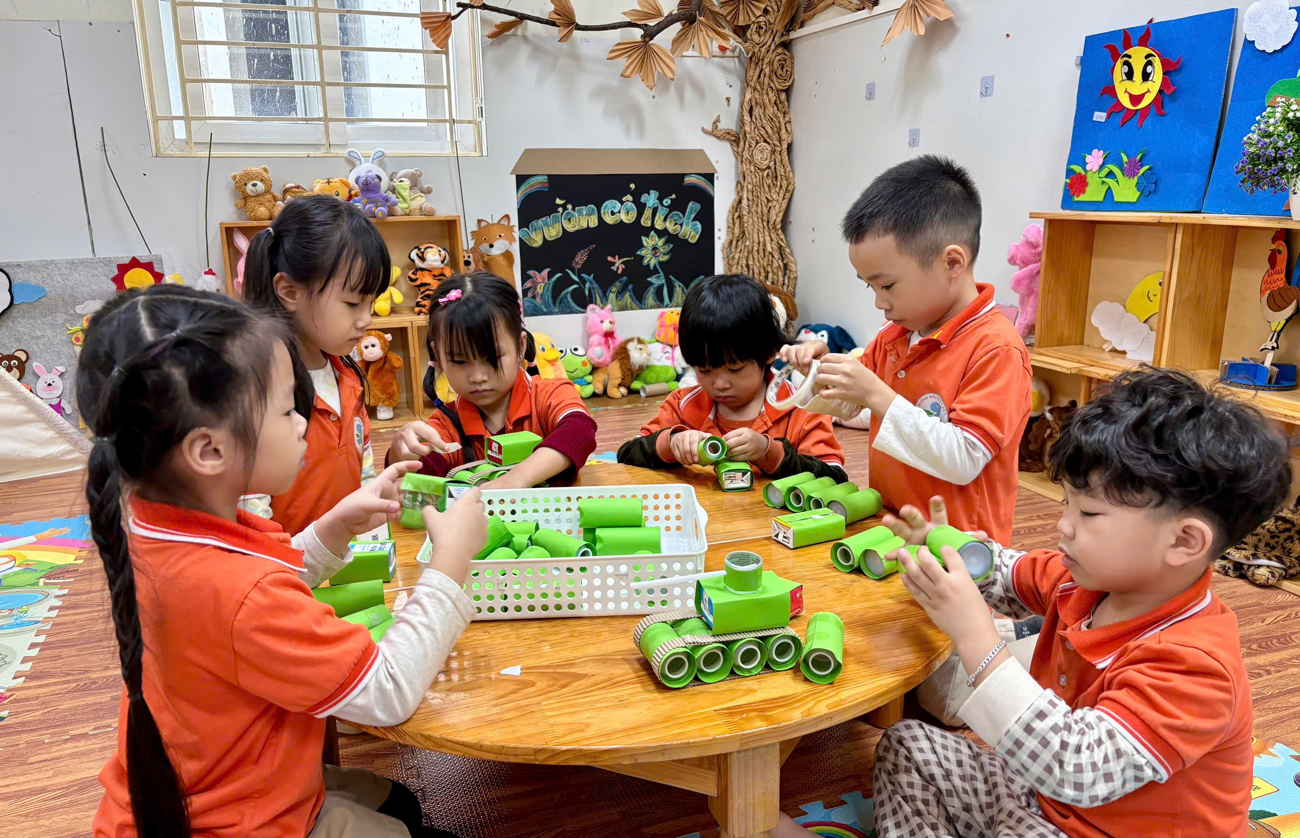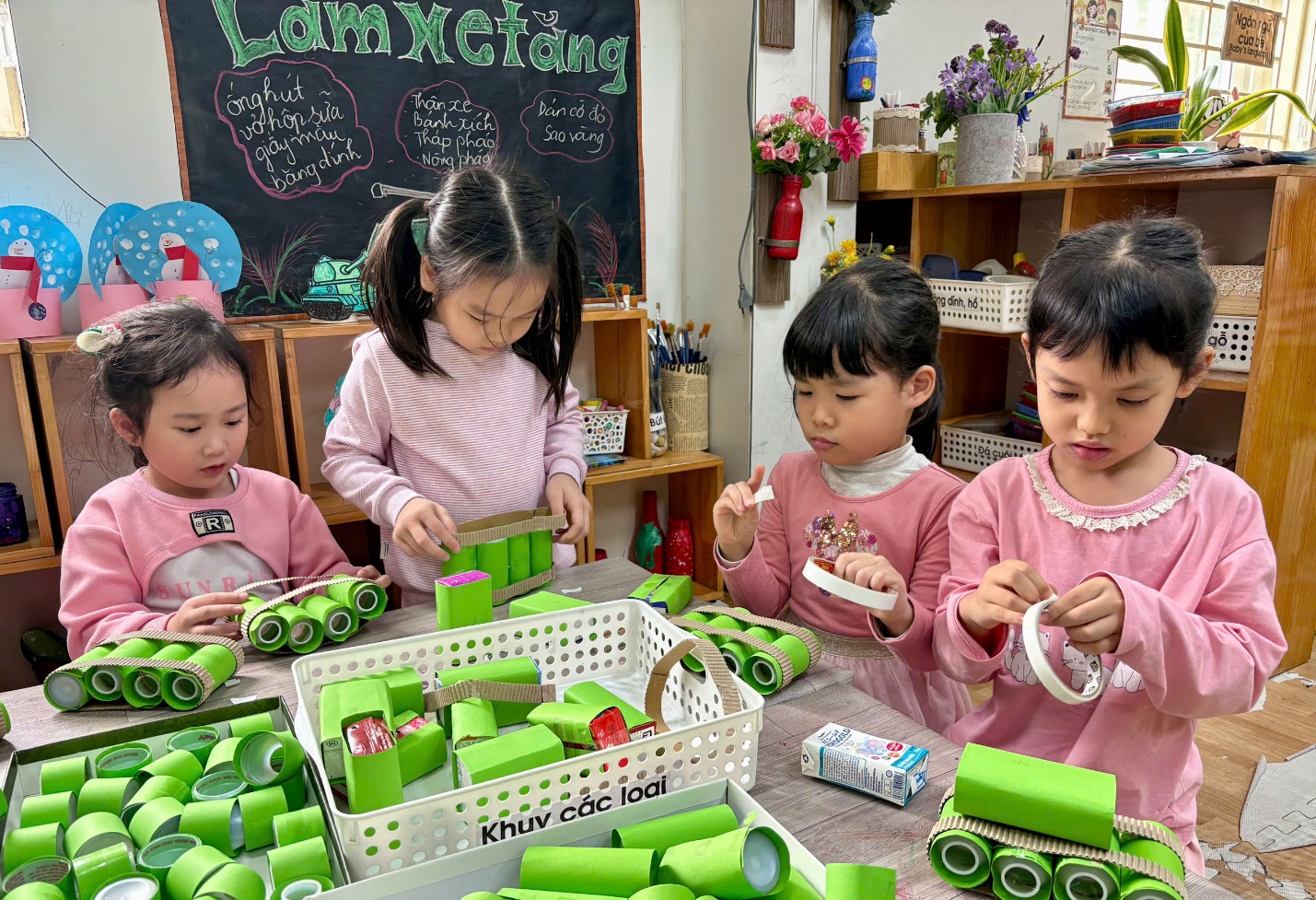 Trong hoạt động STEAM: Làm xe tăng từ vỏ hộp sữa, dưới sự hướng dẫn tận tình của cô giáo, các bé lớp A3 đã cùng nhau tái chế vỏ hộp sữa, ống hút, giấy màu … để sáng tạo nên những chiếc xe tăng xanh mang lá cờ Tổ quốc.