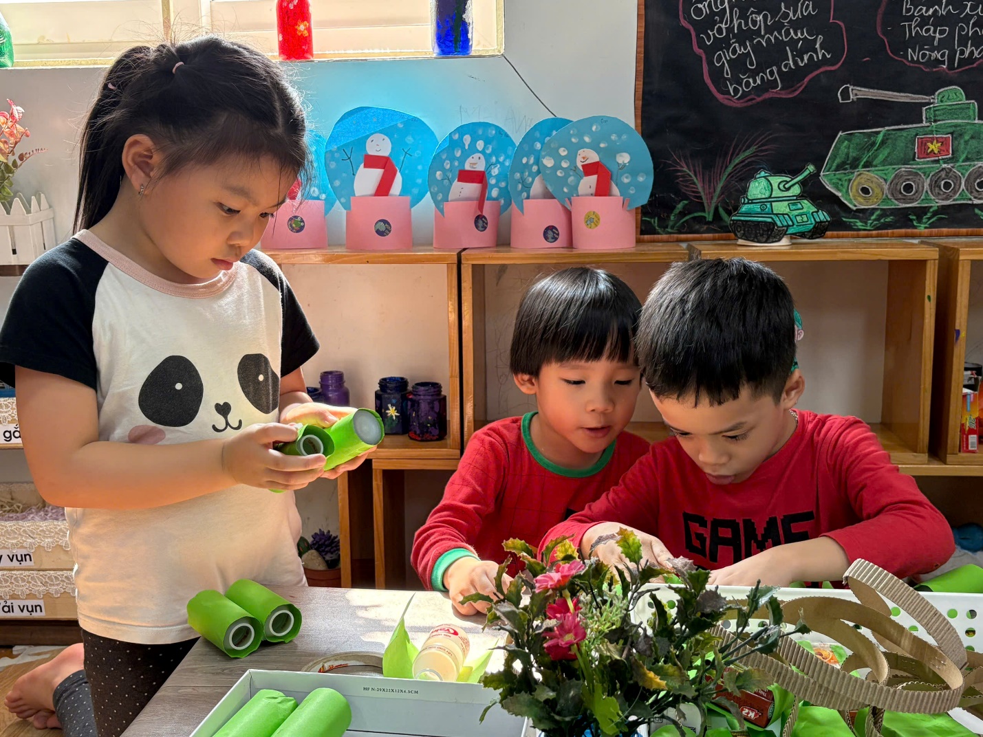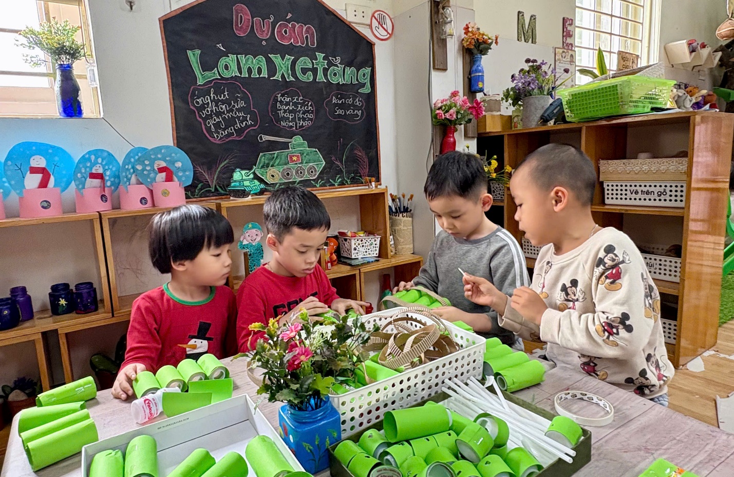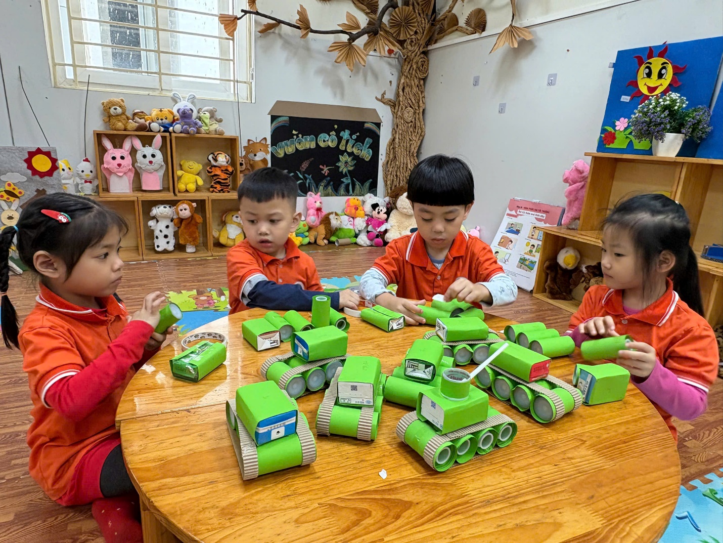 Trong hoạt động STEAM: Làm xe tăng từ vỏ hộp sữa, dưới sự hướng dẫn tận tình của cô giáo, các bé lớp A3 đã cùng nhau tái chế vỏ hộp sữa, ống hút, giấy màu … để sáng tạo nên những chiếc xe tăng xanh mang lá cờ Tổ quốc.