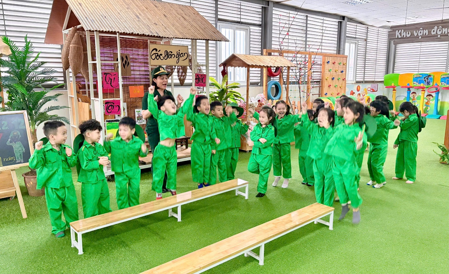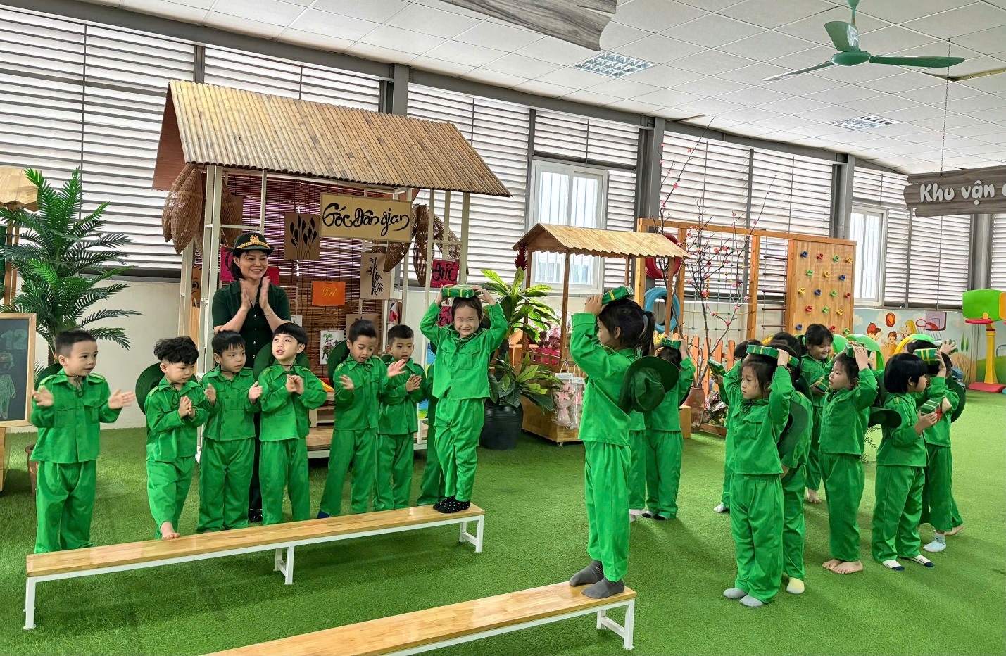 Không khí lớp học trở nên sôi nổi với hoạt động động trải nghiệm: Bé tập làm chú bộ đội với các vận động mô phỏng thao trường quân đội: