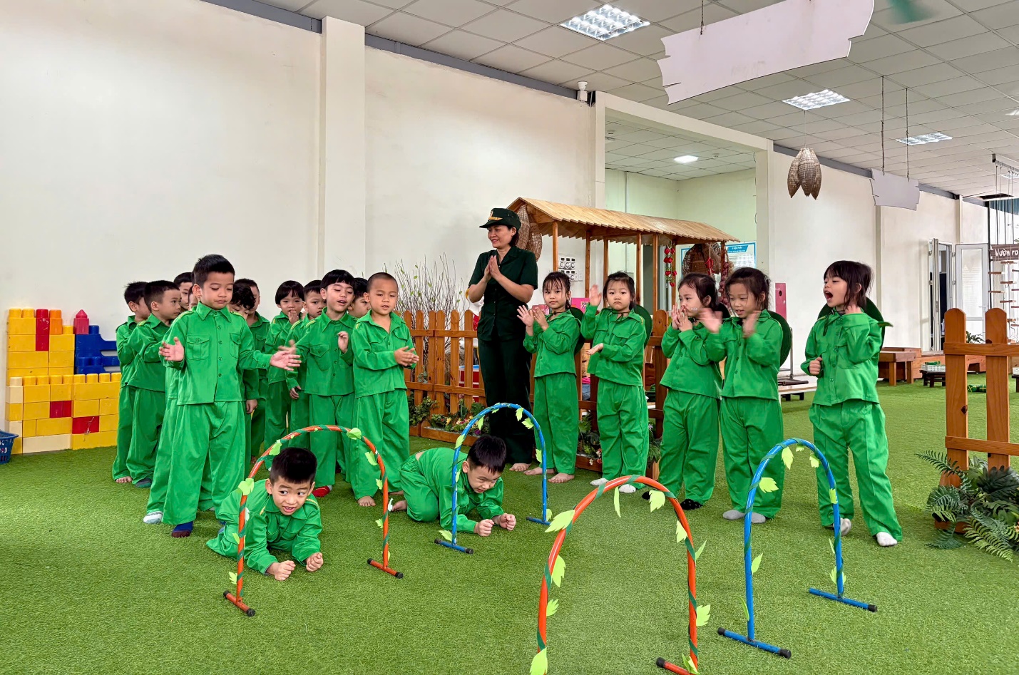 Trong vai những “chú bộ đội nhí”, các bé tỏ ra vô cùng hào hứng, mạnh dạn và tự tin tham gia vận động. Qua đó, trẻ được rèn luyện sự nhanh nhẹn, khéo léo, tinh thần kỷ luật và ý thức tập thể.