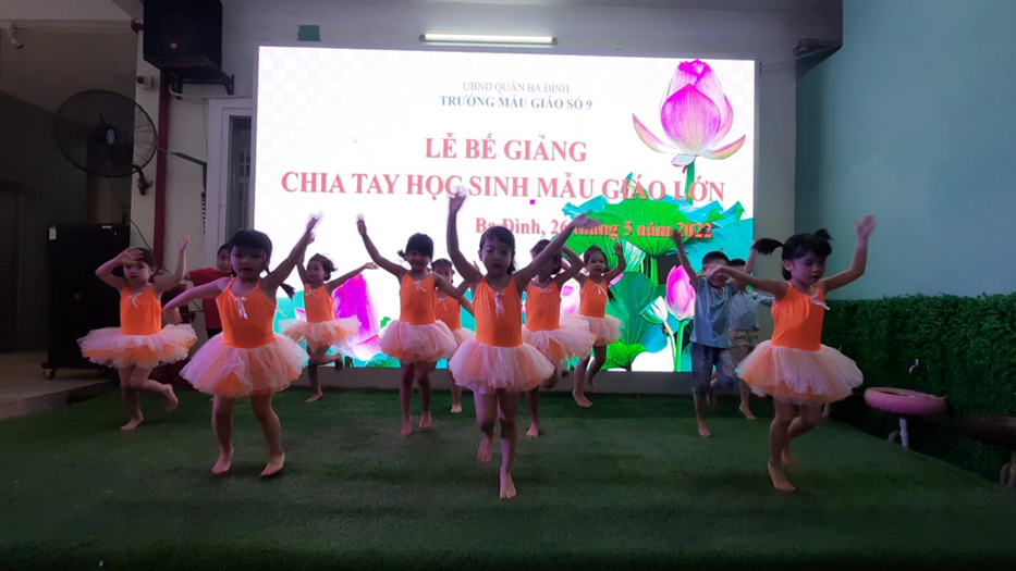 Cũng tại Lễ Bế giảng năm học 2021-2022, nhà trường tổ chức lễ chia tay các con học sinh khối Mẫu giáo lớn để các con chuẩn bị bước sang cấp học mới- cấp tiểu học. Đại diện BGH - cô giáo Hoàng Thị Minh Thu, Bí thư chi bộ, Hiệu trưởng nhà trường đã trao tặng giấy chứng nhận tốt nghiệp mầm non cho các con. Trong giây phút xúc động đó,  các cô thật tự hào khi nhìn thấy các con học sinh của mình đã lớn khôn nhưng cũng thật buồn vì chỉ ít ngày nữa thôi, các con đã xa mái trường Số 9 thân yêu với biết bao kỉ niệm.