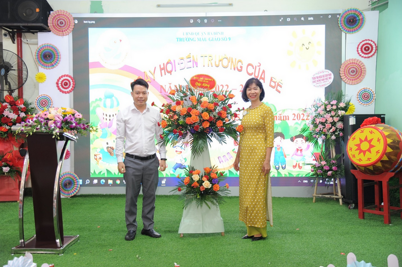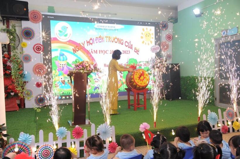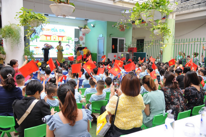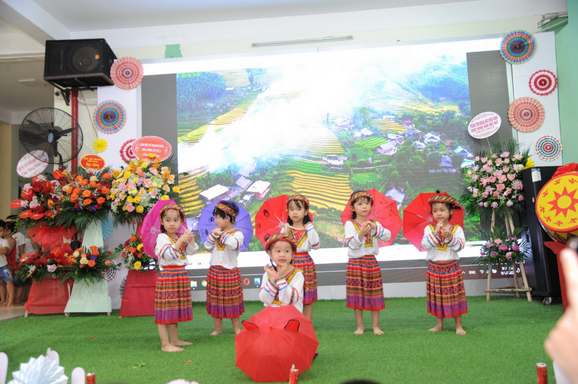 Mở đầu buổi lễ, sau phần tuyên bố lý do, giới thiệu đại biểu, các bé mẫu giáo 3 tuổi lần đầu đến trường được chào đón bằng cờ, hoa, những tràng pháo tay và cả tình cảm yêu thương của những người mẹ thứ hai ở trường của các con.