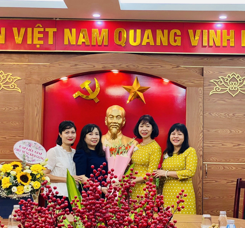 Bà Lê Thị Thu Hà - Quận ủy viên, trưởng phòng tư pháp quận tặng hoa và chúc mừng nhà trường nhân dịp khai giảng