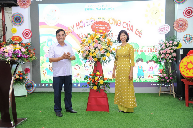 Ông Nguyễn Trung Thành, Phó Bí thư Đảng ủy, Chủ tịch MTTQ phường Liễu Giai tặng hoa và chúc mừng nhà trường.