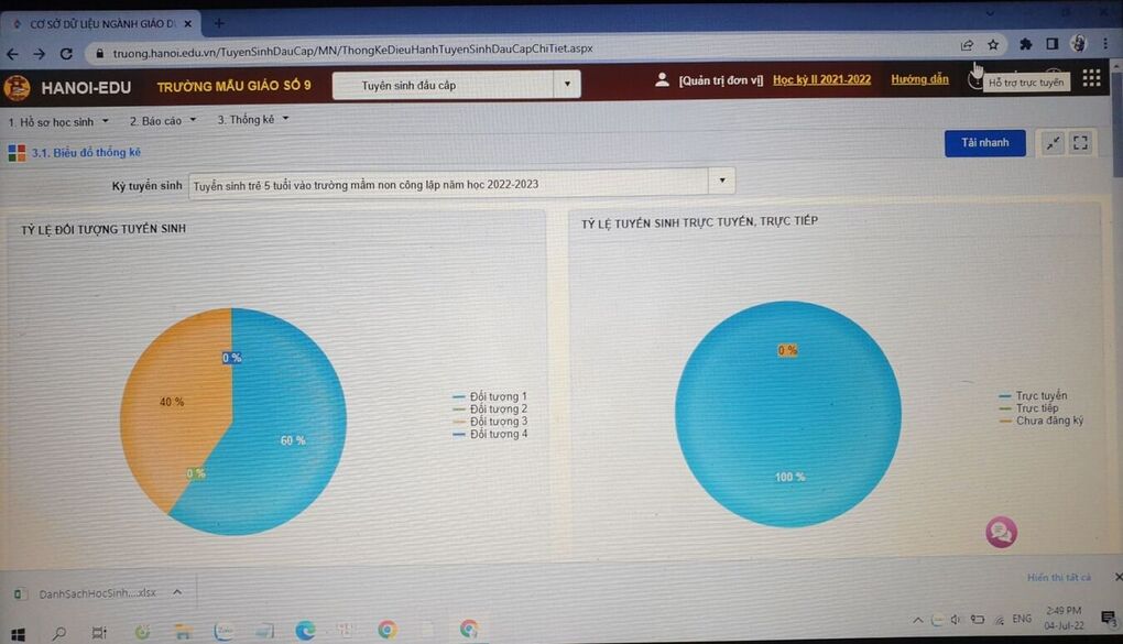 Sáng 04/07/2022, nhà trường đã tổ chức hỗ trợ đăng ký tuyển sinh trực tuyến tại trường cho các con lứa tuổi Mẫu giáo Lớn (năm 2017), tổ công tác hỗ trợ tuyển sinh nghiêm túc hỗ trợ phụ huynh đăng ký trực tuyến. Cuối buổi sáng, kết quả tuyển sinh đạt 100% chỉ tiêu theo kế hoạch tuyển sinh của trường.
