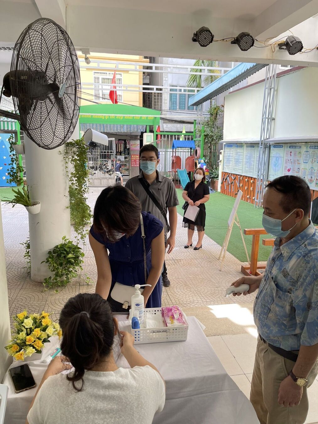 Tiếp đón phụ huynh, sát khuẩn, đo thân nhiệt, hỗ trợ khai báo y tế trước khi vào phòng tuyển sinh: