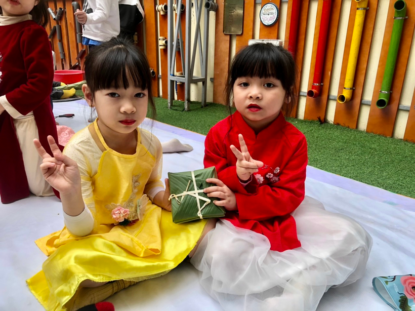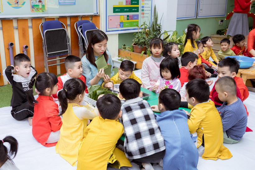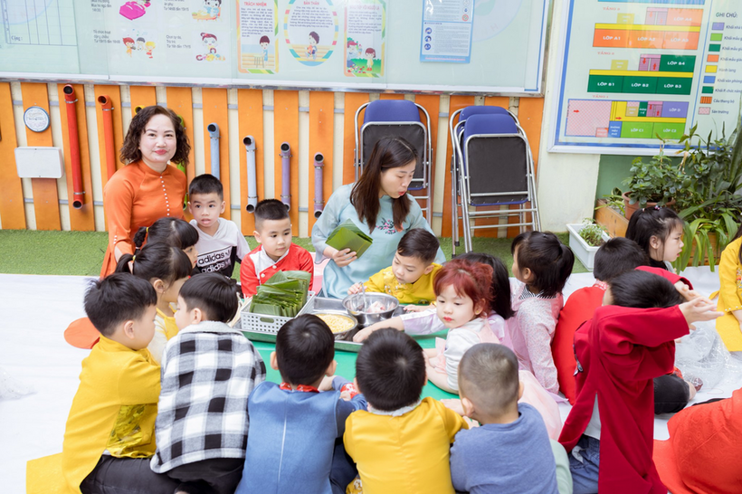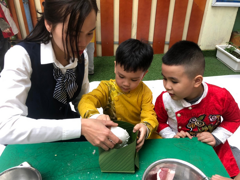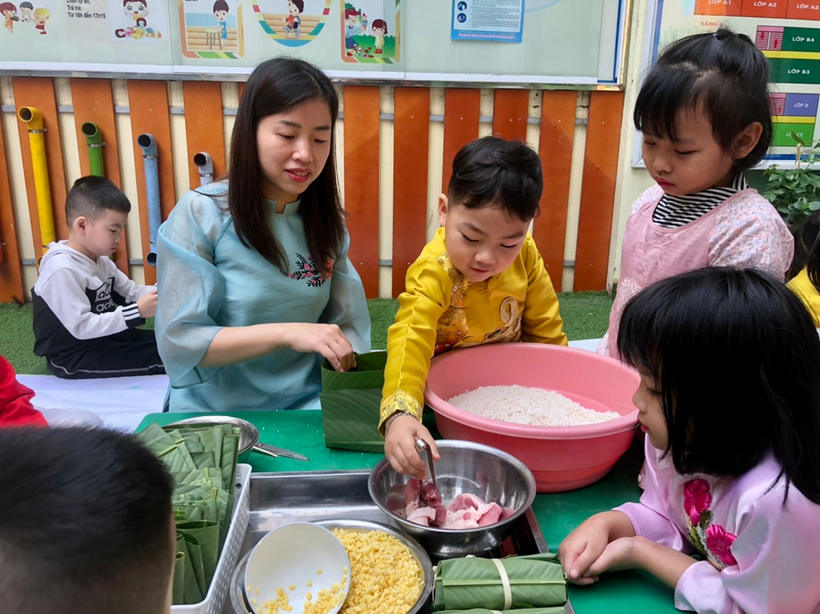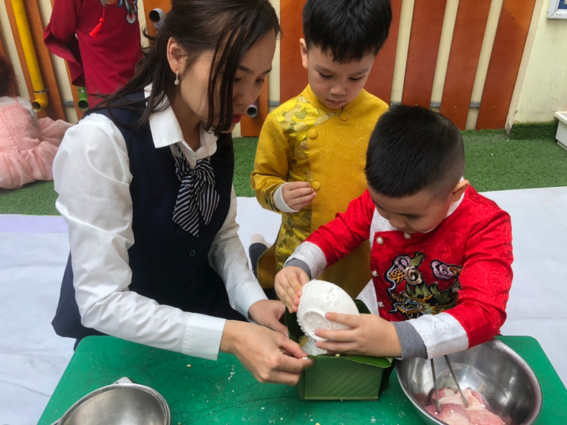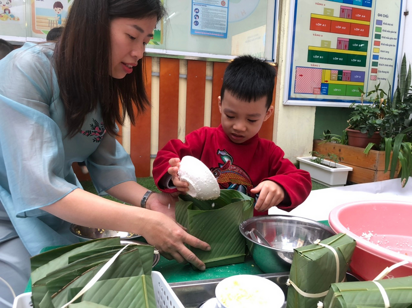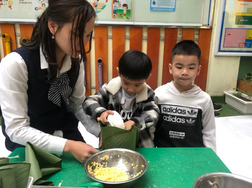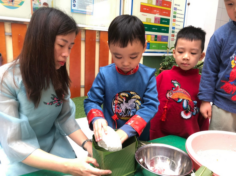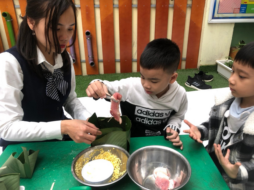 Trước khi bắt tay vào gói bánh, các bé được cô giáo kể cho nghe câu chuyện "Sự tích bánh chưng bánh dày" và hướng dẫn đầy đủ các bước làm. Đây là một cơ hội để các bé được trải nghiệm và tích lũy được thêm nhiều kỹ năng sống: Các bé học cách hoạt động nhóm, được giao nhiệm vụ trong nhóm, được tham gia bàn bạc và được cô giáo phân công công việc cụ thể. Các bé được tìm hiểu các nguyên liệu gói bánh, những chiếc lá dong được rửa sạch sẽ, lau khô, những nguyên liệu cần thiết gồm: gạo nếp, lá dong, đỗ xanh và thịt lợn, quy trình gói bánh chưng...Tất cả đã sẵn sàng để các bé được trải nghiệm một không gian Tết cổ truyền ngay tại trường học.