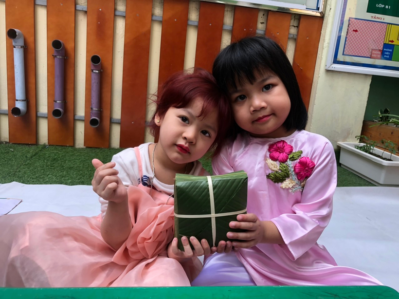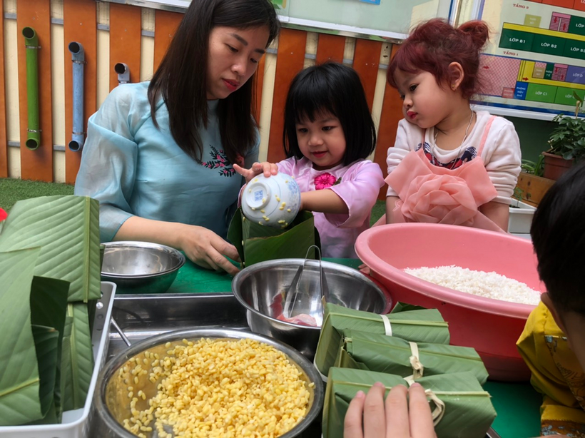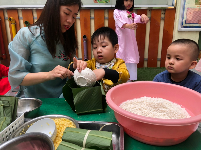 Dưới đây là một số hình ảnh trong buổi trải nghiệm gói bánh chưng của các bé MGL A2.