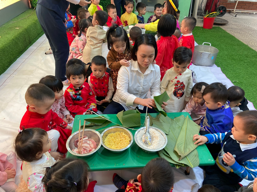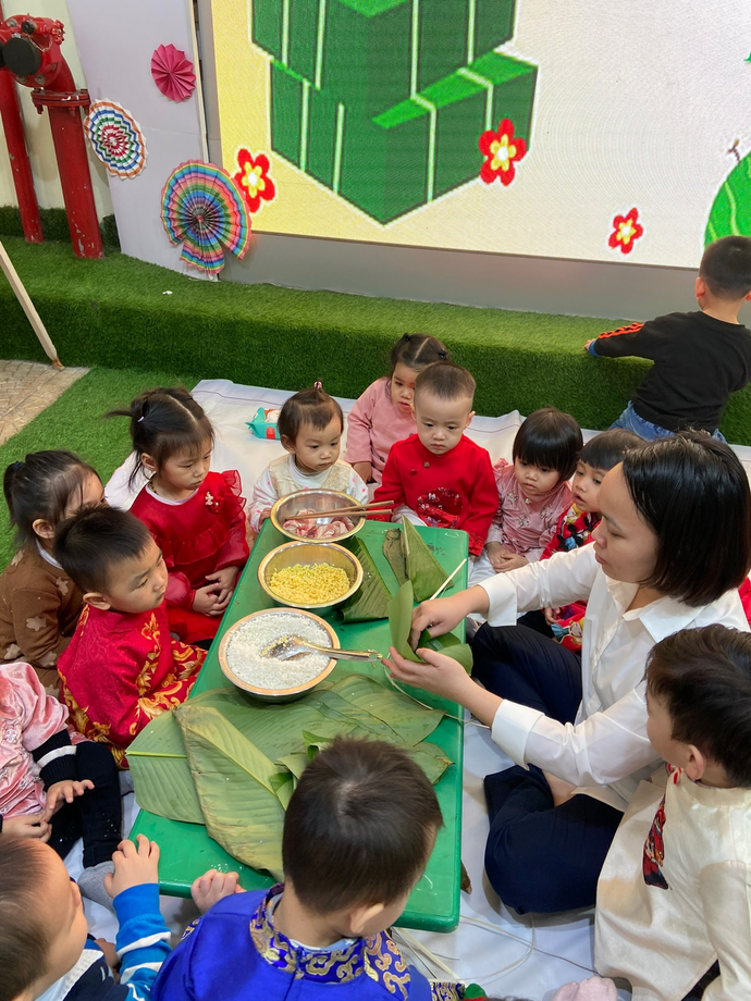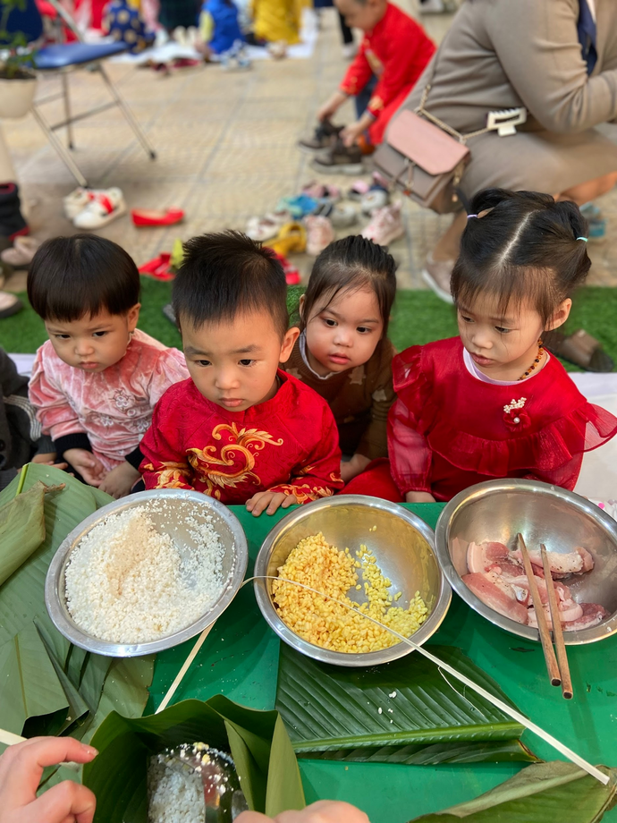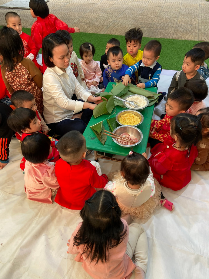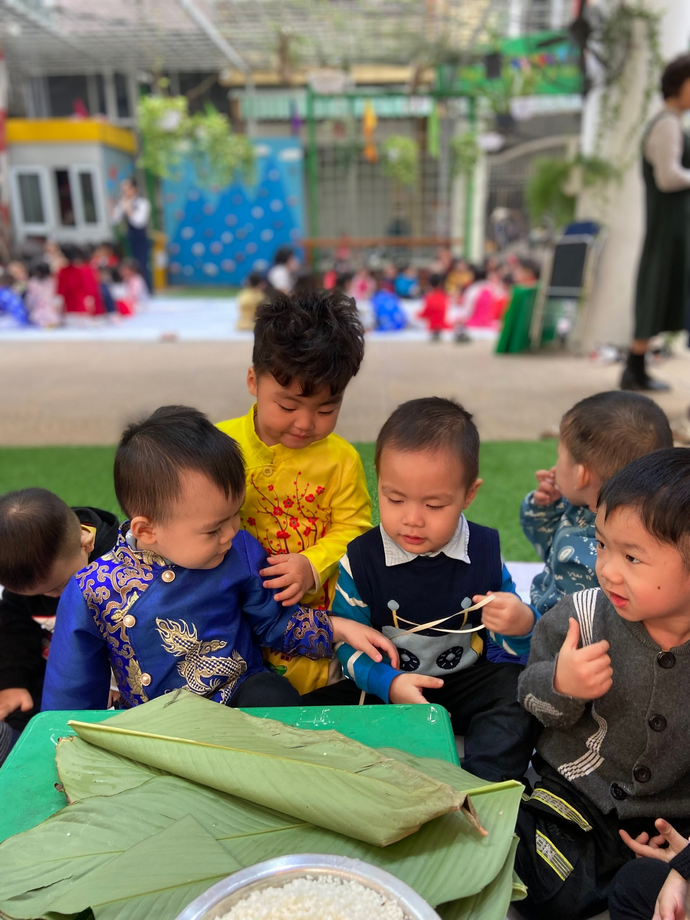 Từ sáng sớm các bé lớp Nhà trẻ D2 đã mặc cho mình những bộ áo dài thật đẹp và đến lớp thật sớm trong không khí hân hoan để Chào đón "Ngày hội bánh chưng".