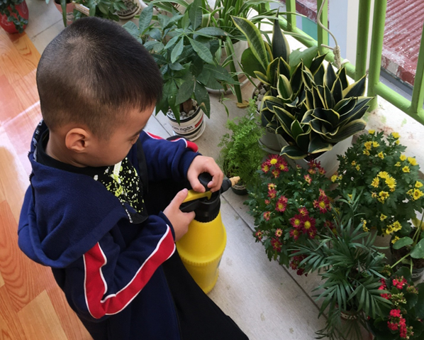 Dạy bé chăm sóc cây để trường, lớp luôn có không gian xanh.