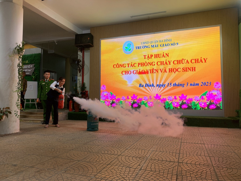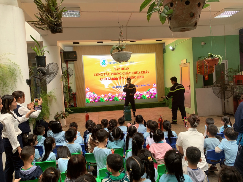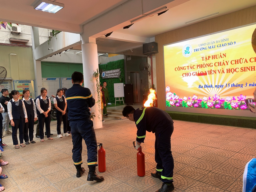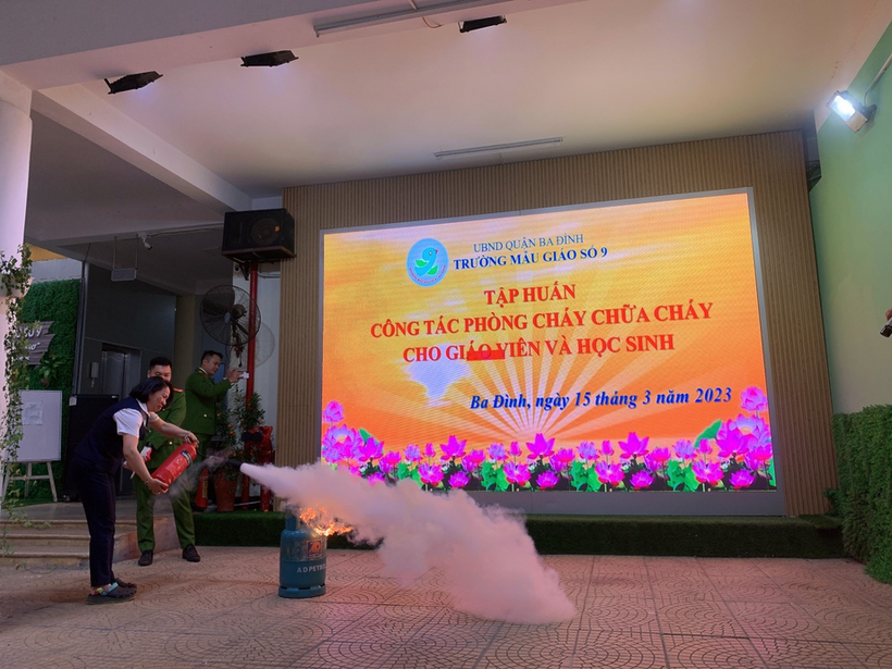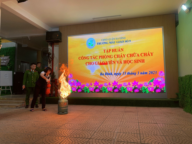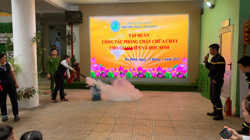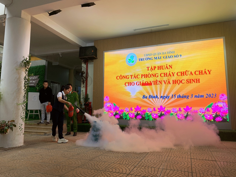 Buổi tập huấn có sự phối hợp hỗ trợ của các chiến sĩ đội PCCC Công an Quận Ba Đình, Trung tâm bồi dưỡng kỹ năng phòng vệ thông minh cùng sự tham gia của hơn 200 học sinh, cán bộ giáo viên, nhân viên trường Mẫu giáo Số 9.