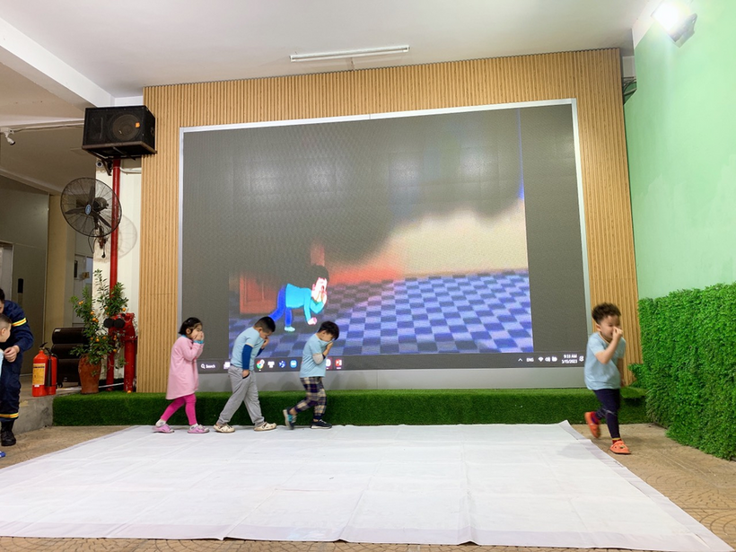 Các con học sinh cũng được thực hành cách xử lí tình huống khi có đám cháy.