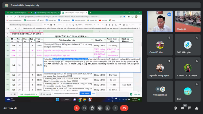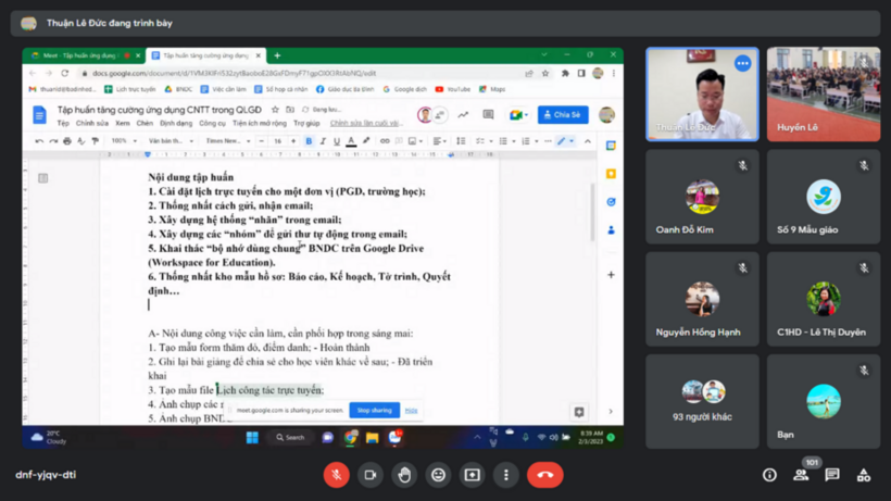 Bằng hình thức tập huấn trực tiếp và trực tuyến, trong hội nghị Đ/c Lê Đức Thuận – Trưởng phòng Giáo dục và Đào tạo quận Ba Đình đã trực tiếp giảng giải, hướng dẫn các trường phương thức quản lý và sử dụng hòm thư công vụ (@badinhedu.vn); cài đặt lịch trực tuyến cho một đơn vị (PGD, trường học); thống nhất cách gửi, nhận email; lập các nhãn (tag) trong email; xây dựng các “nhóm” để gửi thư tự động trong email; khai thác “bộ nhớ dùng chung” BNDC trên Google Drive (Workspace for Education); thống nhất kho mẫu hồ sơ: Báo cáo, Kế hoạch, Tờ trình, Quyết định… Thống nhất cách đặt tên file.