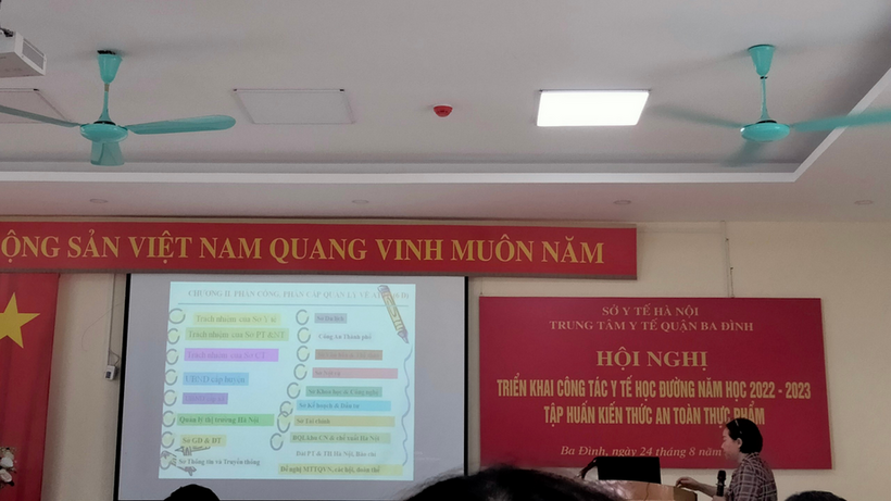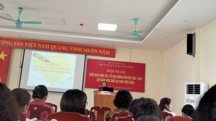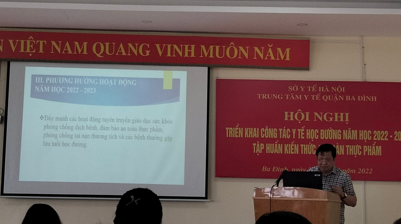 Tại buổi tập huấn, cán bộ và nhân viên y tế các trường mầm non, tiểu học, THCS trong quận Ba Đình đã được nghe đ/c Bùi Văn Hào – giám đốc TTYT quận Ba Đình báo cáo tổng kết công tác y tế học đường năm học 2021- 2022 và triển khai công tác y tế học đường năm học 2022- 2023.