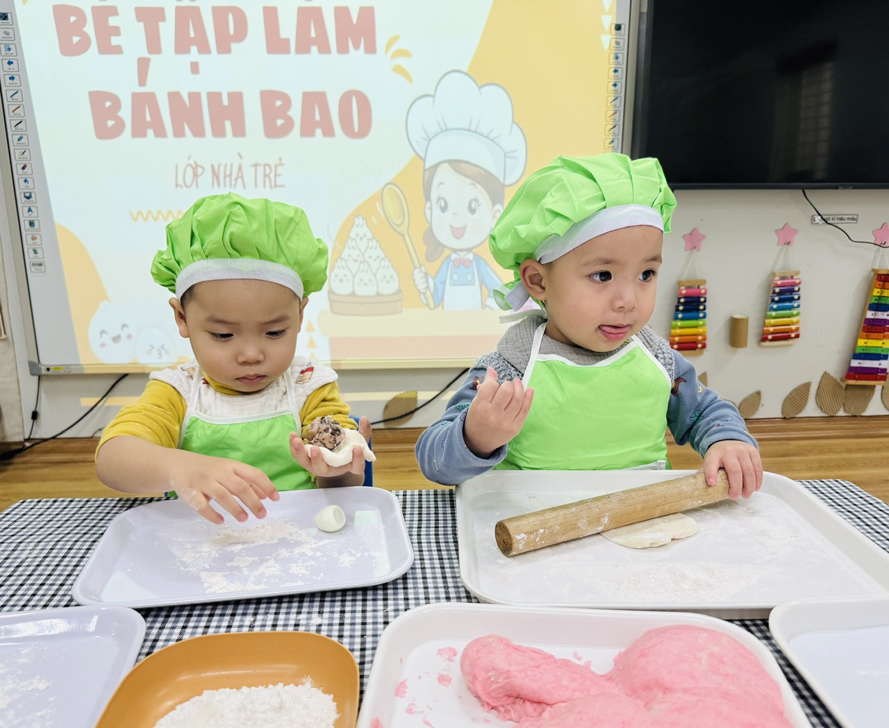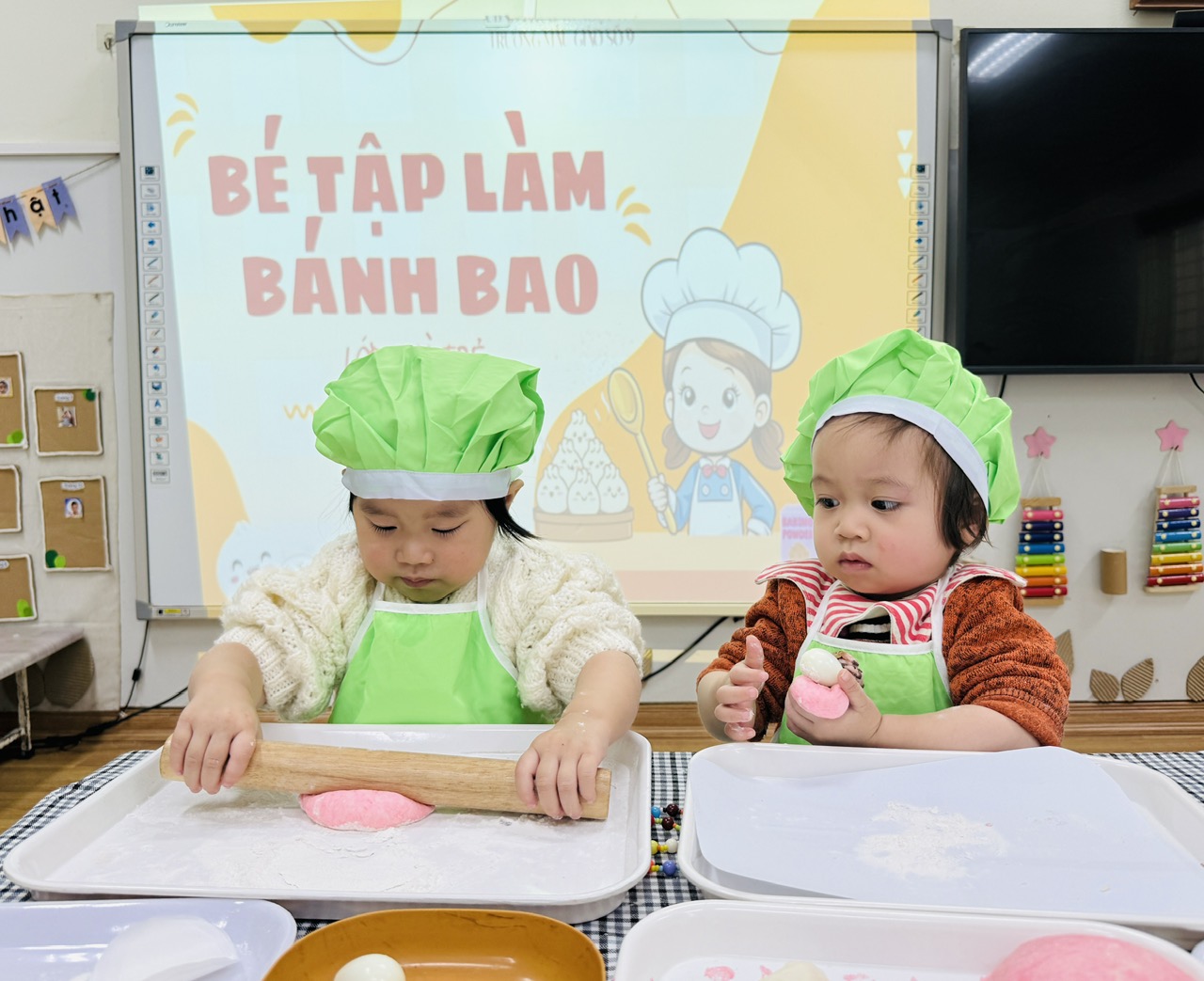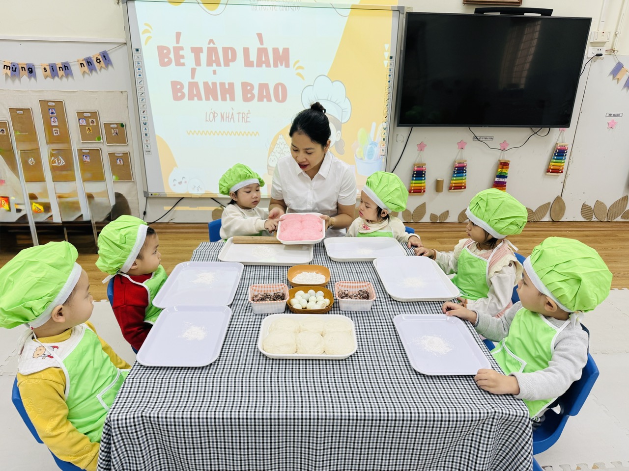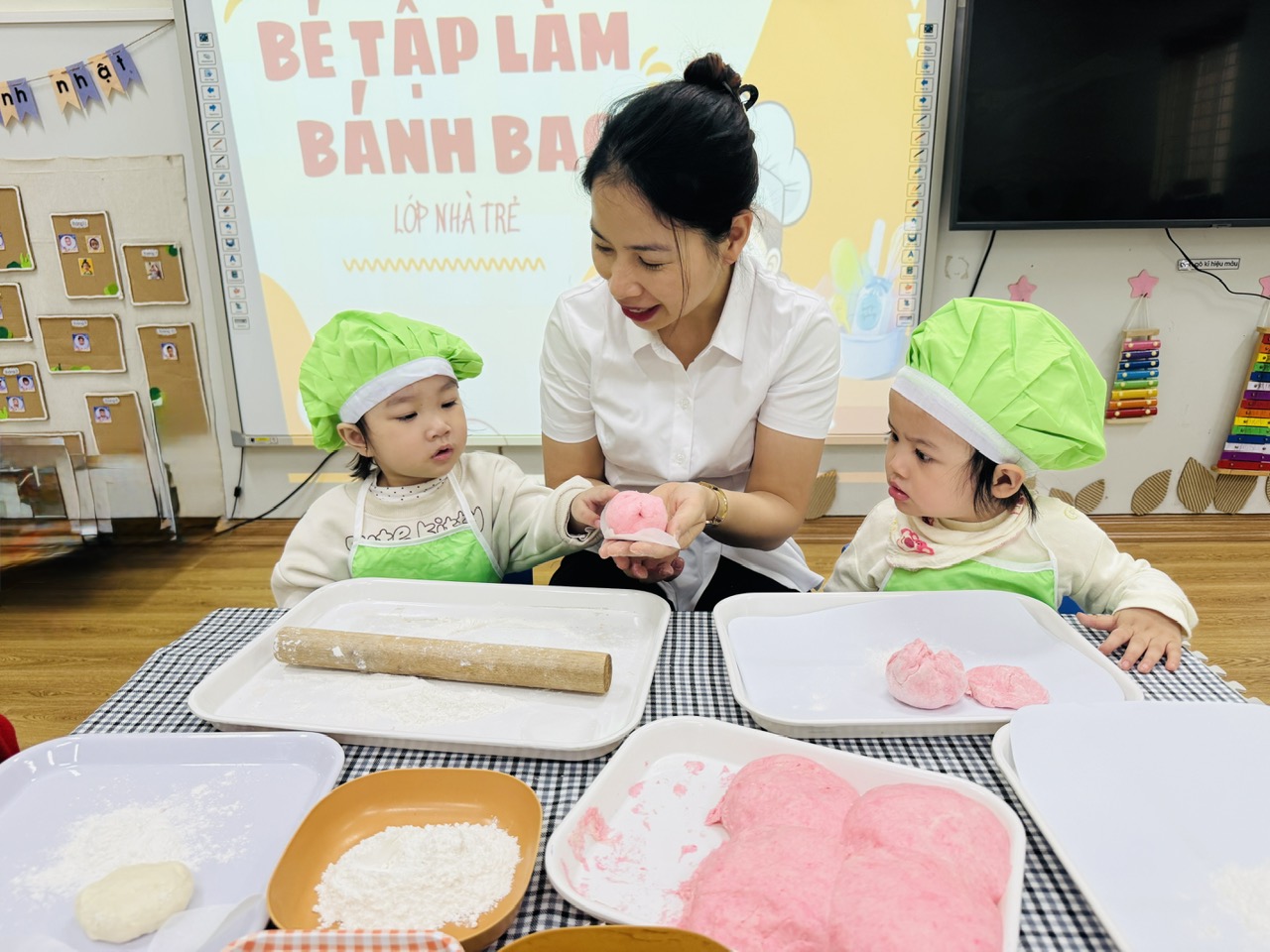 Hoạt động được thiết kế phù hợp với đặc điểm lứa tuổi 24–36 tháng, chú trọng cho trẻ trải nghiệm bằng giác quan: sờ bột mềm, nắm bột, lăn bột, quan sát hình dáng bánh. Qua đó, trẻ được rèn luyện kỹ năng vận động tinh của bàn tay, tăng khả năng phối hợp tay – mắt, đồng thời phát triển ngôn ngữ thông qua việc gọi tên các nguyên liệu quen thuộc như bột – bánh – nhân.