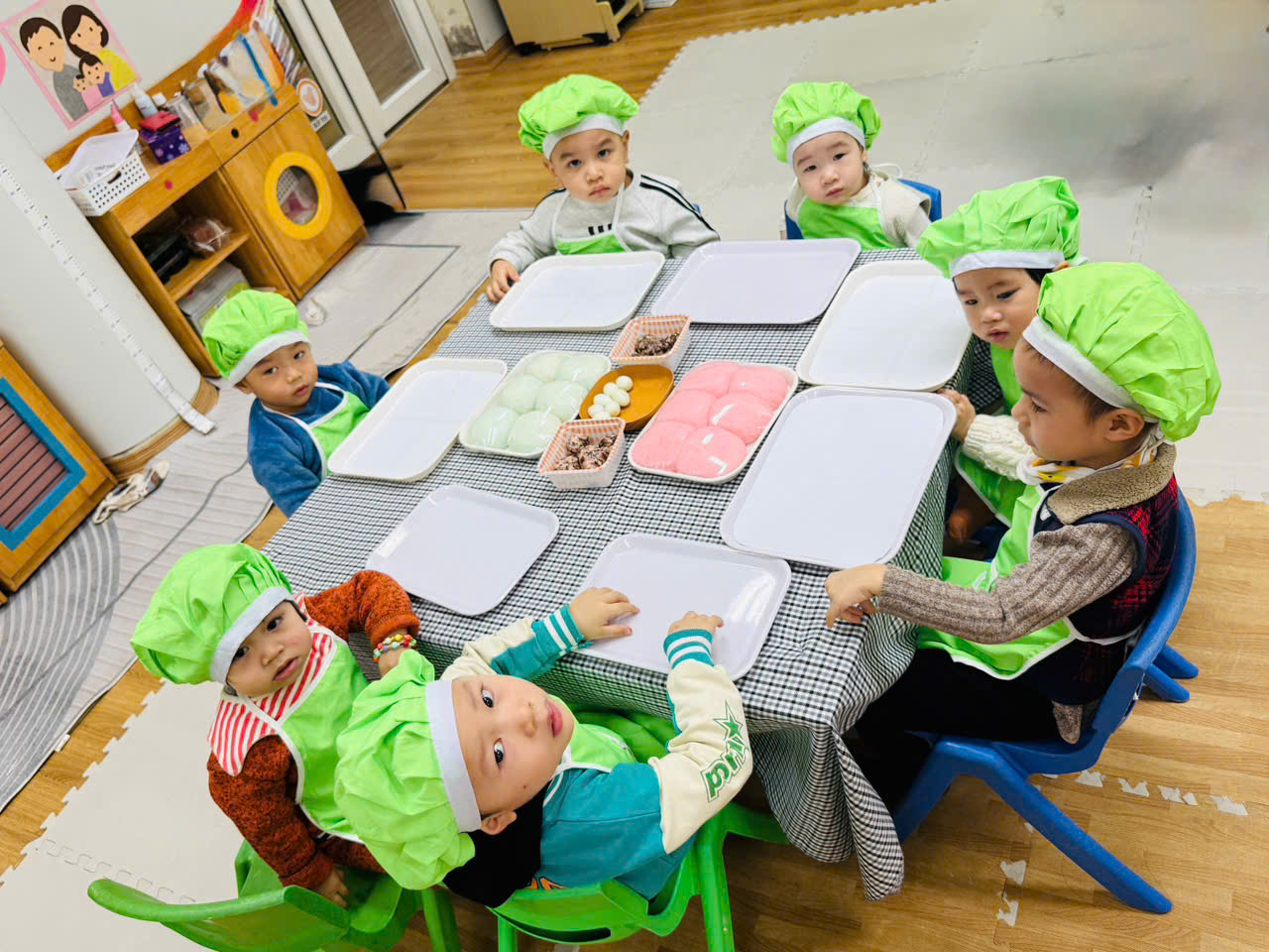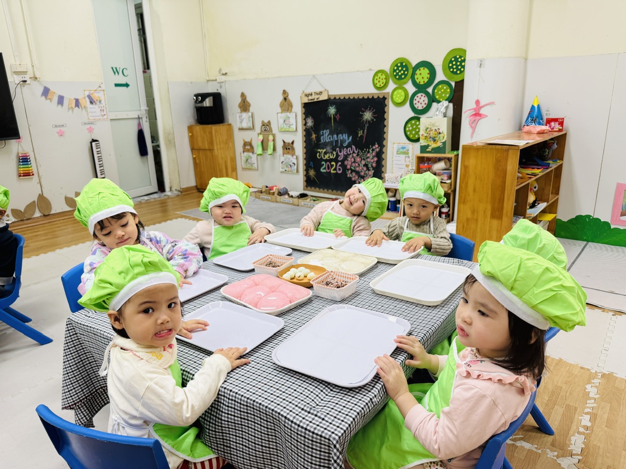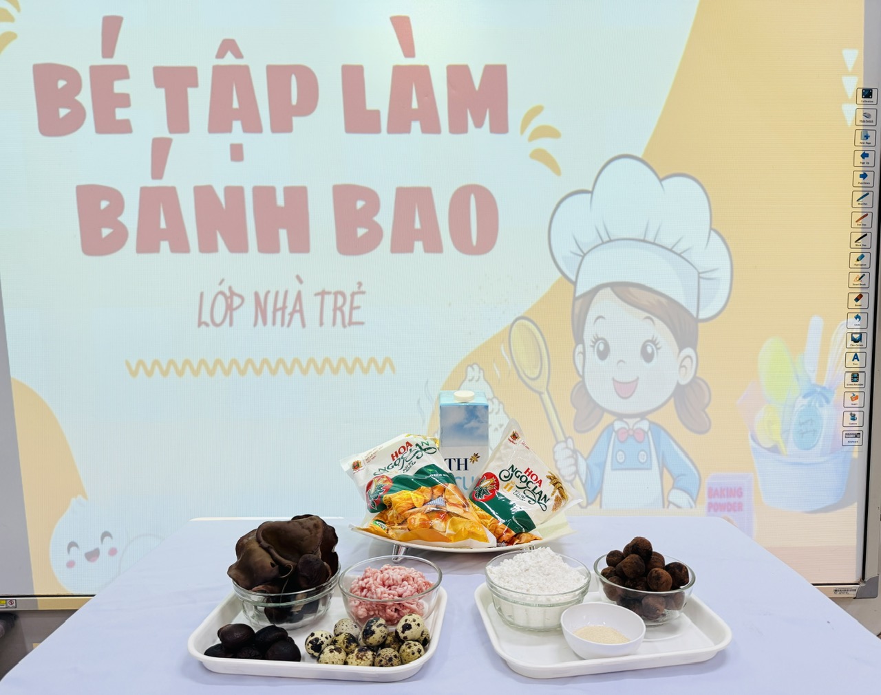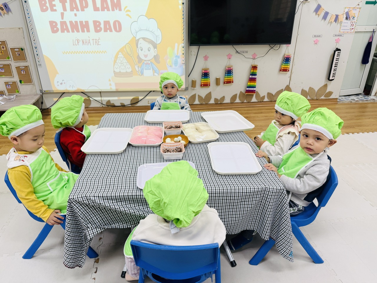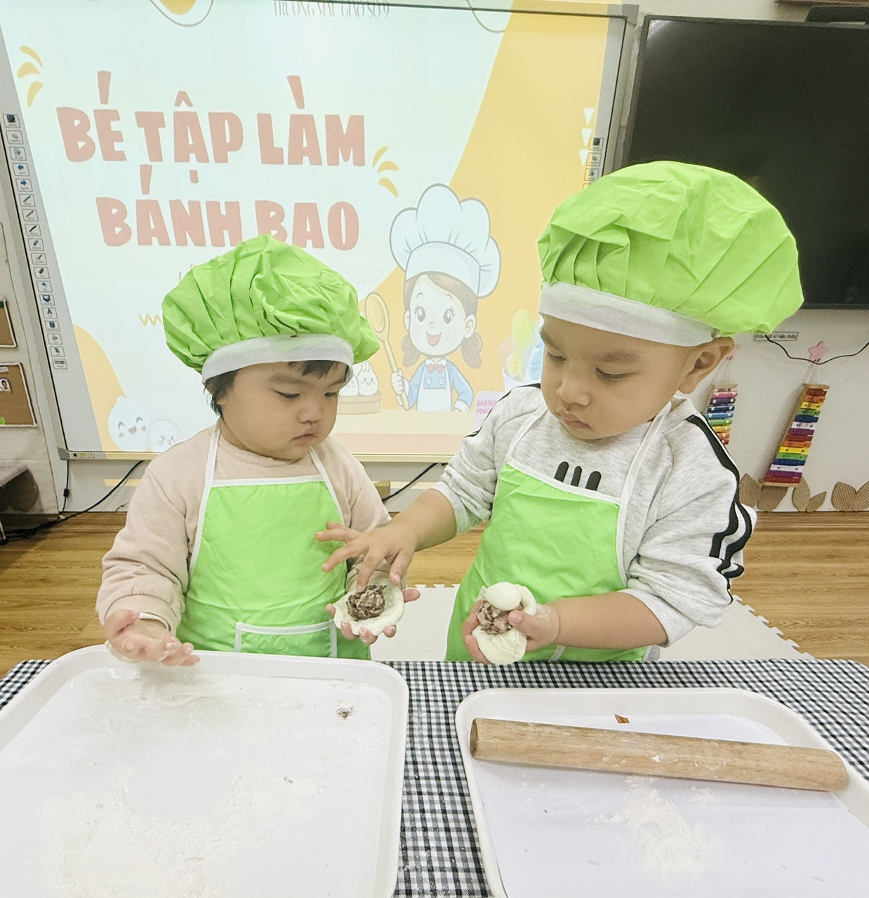 Hoạt động được thiết kế phù hợp với đặc điểm lứa tuổi 24–36 tháng, chú trọng cho trẻ trải nghiệm bằng giác quan: sờ bột mềm, nắm bột, lăn bột, quan sát hình dáng bánh. Qua đó, trẻ được rèn luyện kỹ năng vận động tinh của bàn tay, tăng khả năng phối hợp tay – mắt, đồng thời phát triển ngôn ngữ thông qua việc gọi tên các nguyên liệu quen thuộc như bột – bánh – nhân.