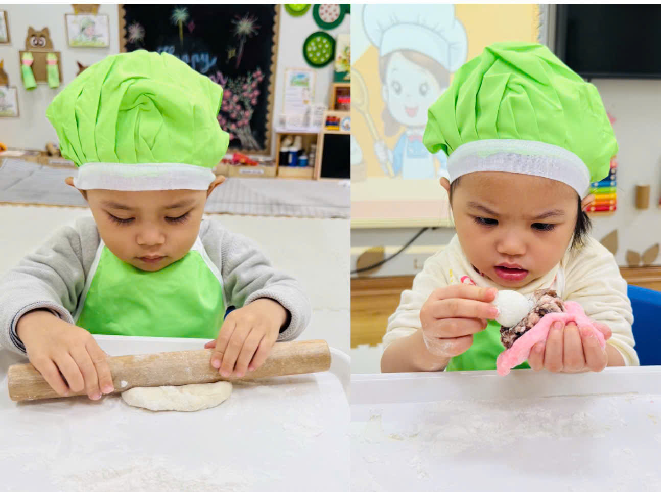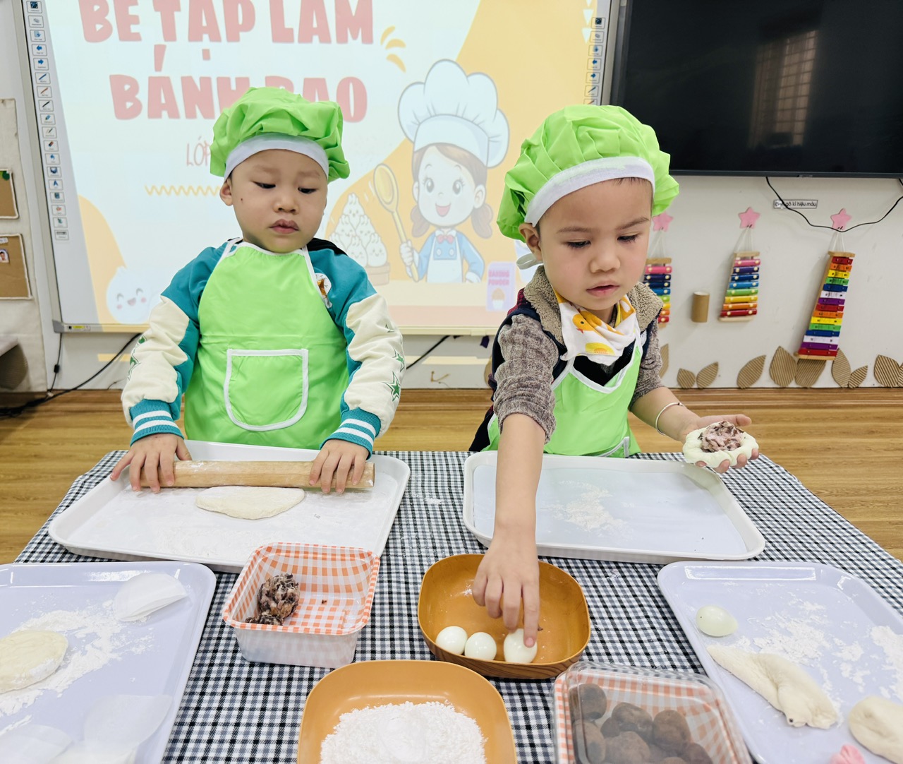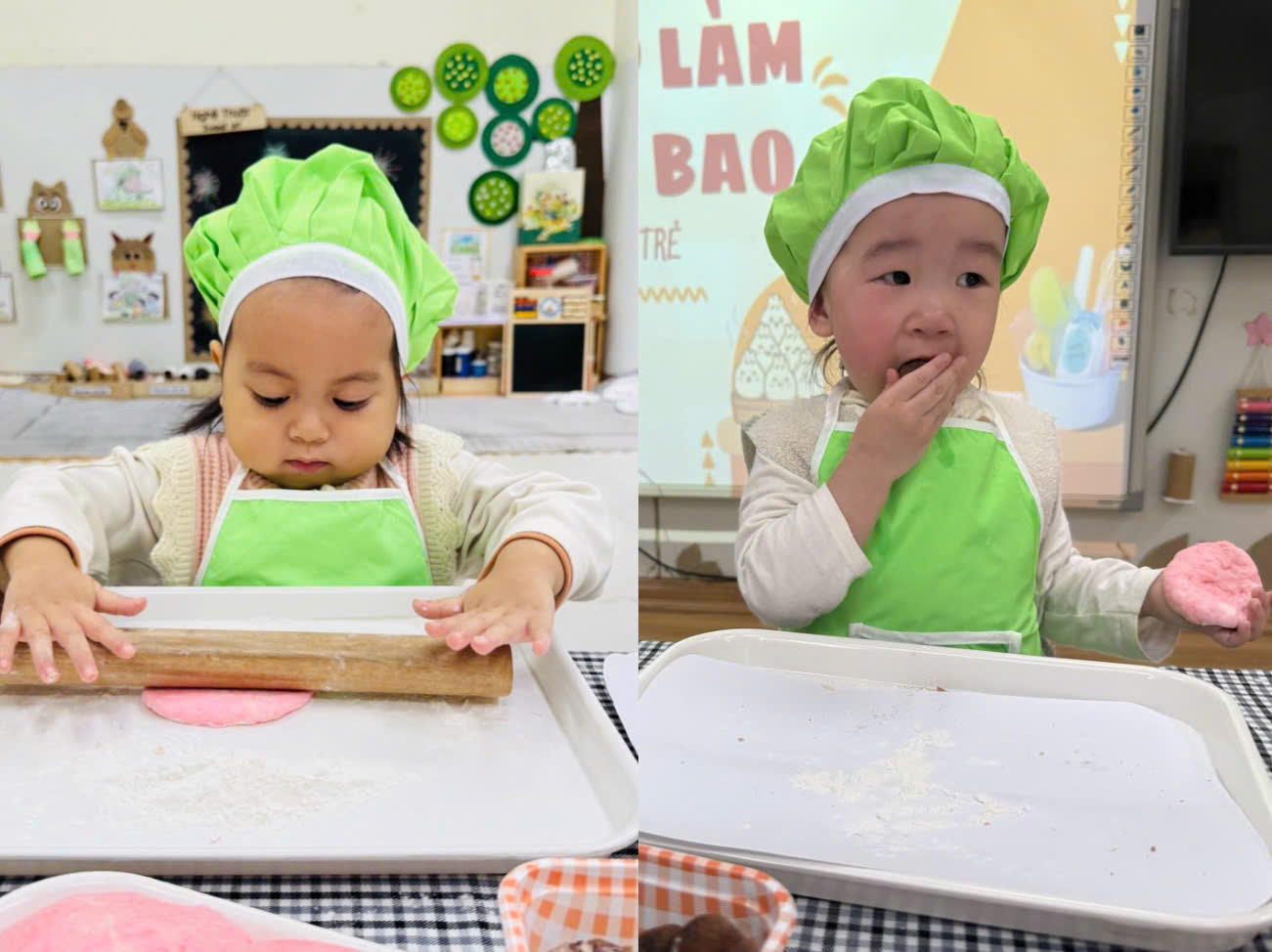 Trong vai những “đầu bếp nhí”, các con được khoác lên mình tạp dề, đội mũ đầu bếp xinh xắn và trực tiếp tham gia các công đoạn đơn giản như: lăn bột, cán bột, nặn bánh, cho nhân vào bánh dưới sự hướng dẫn và hỗ trợ nhẹ nhàng của các cô giáo.