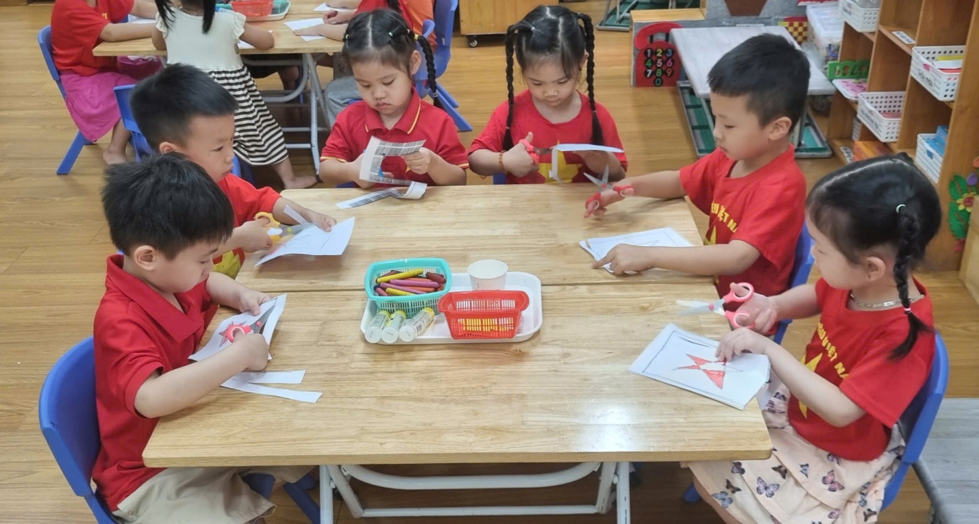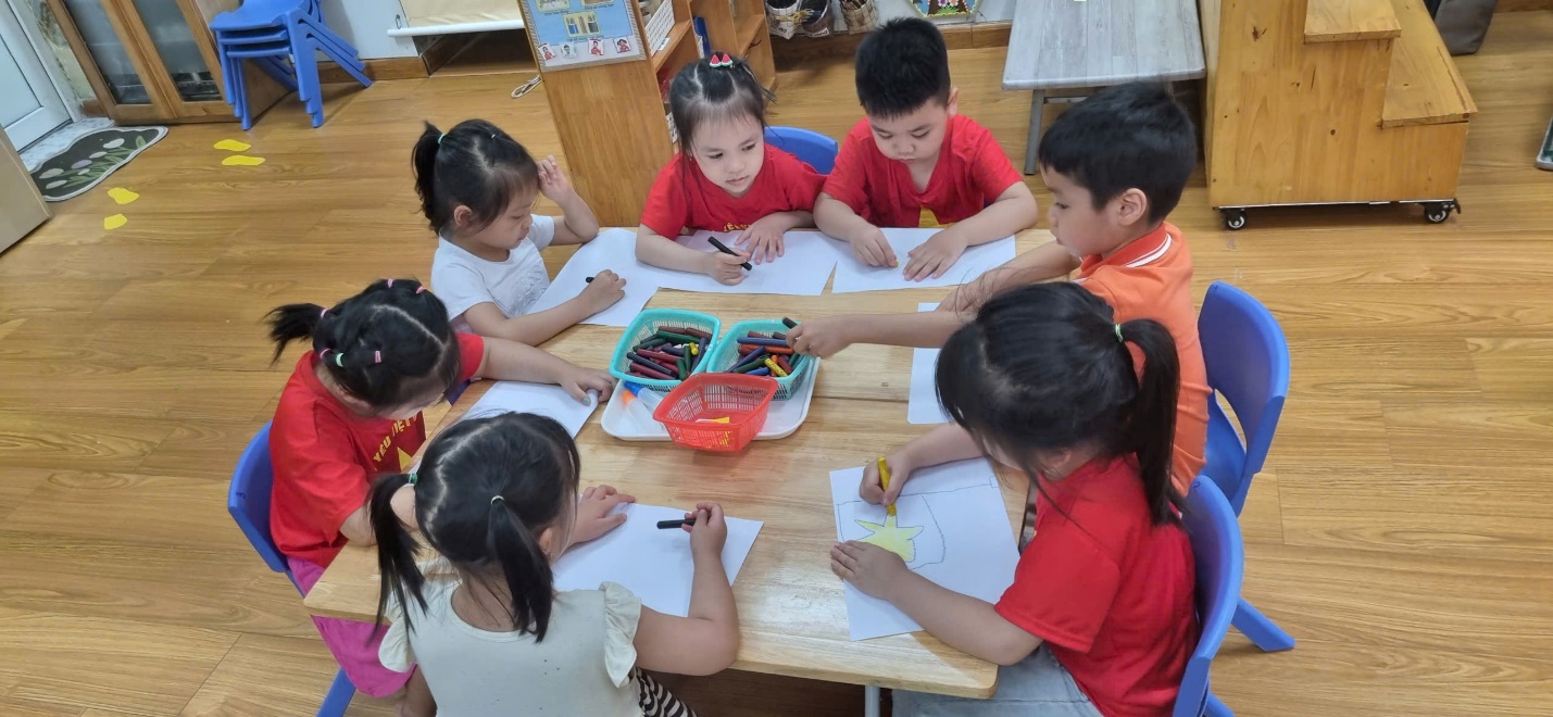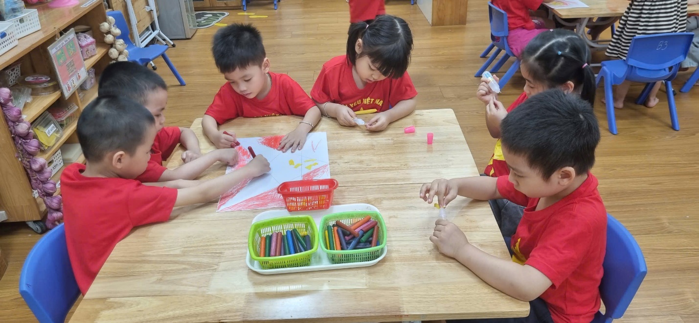 Trong các giờ hoạt động tạo hình, các bé được tham gia vẽ, tô màu và cắt dán hình ảnh lá cờ Tổ quốc