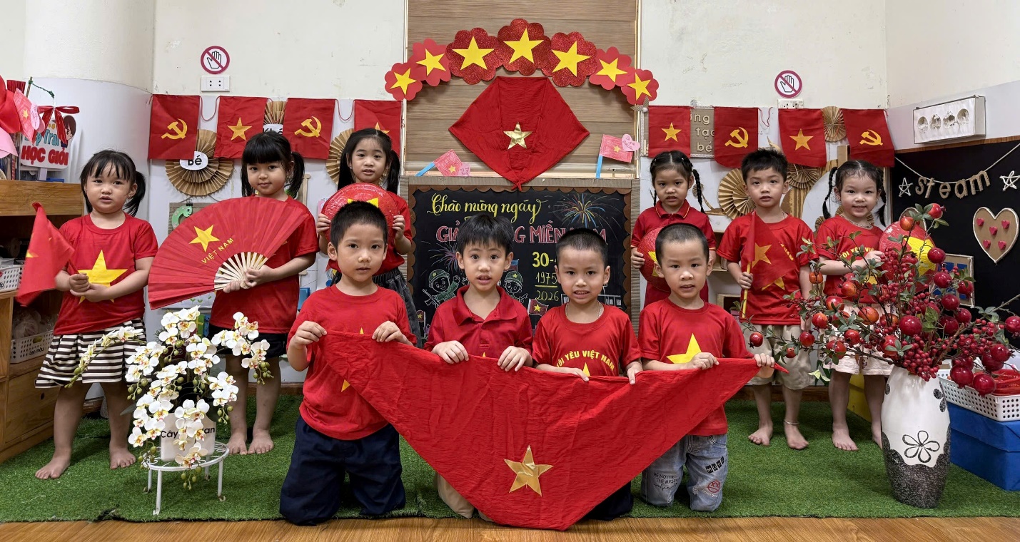 Đặc biệt, hoạt động biểu diễn và trưng bày sản phẩm đã tạo điểm nhấn ấn tượng. Các bé trong trang phục áo đỏ sao vàng, tay cầm cờ Tổ quốc, quạt giấy… tự tin thể hiện tình cảm của mình qua những bài hát, lời chào mừng. Góc trưng bày được trang trí rực rỡ với cờ, hoa và khẩu hiệu đã góp phần tạo nên không khí trang nghiêm nhưng vẫn gần gũi, phù hợp với lứa tuổi.