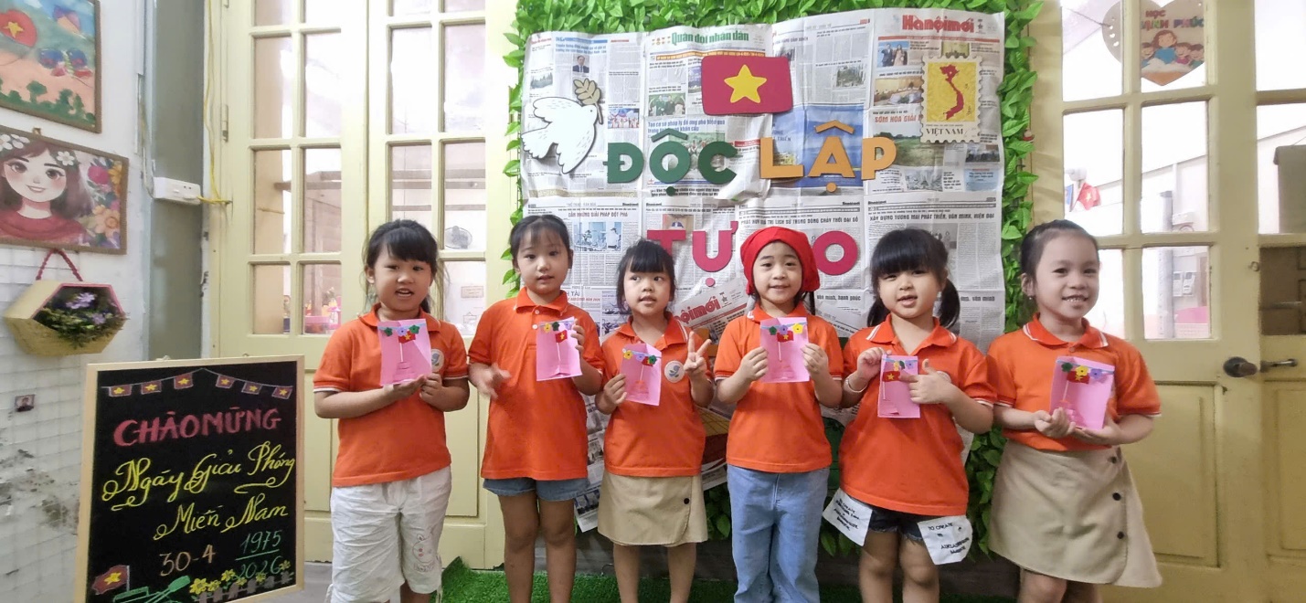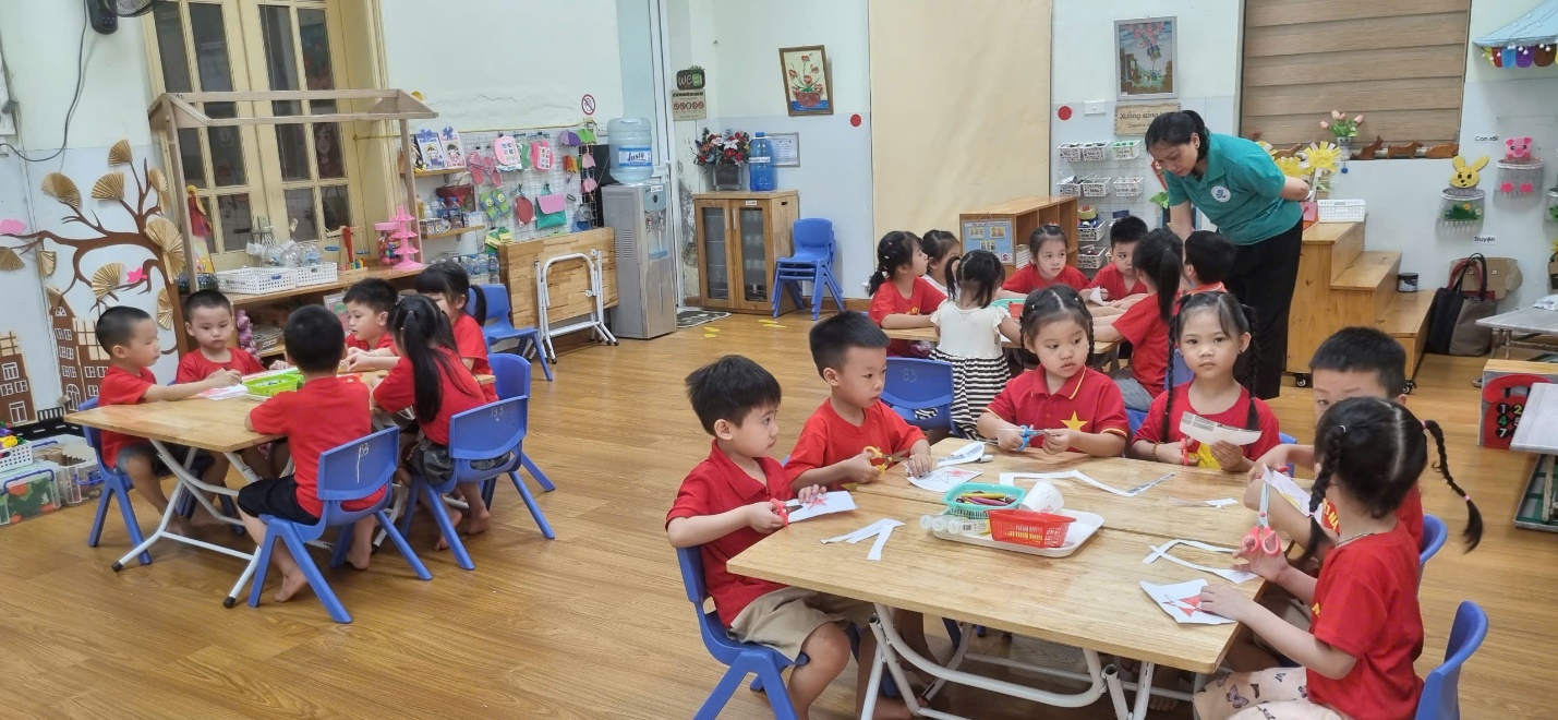 Bên cạnh đó, trẻ còn tham gia hoạt động thủ công như cắt, dán và trang trí cột cờ chào mừng ngày 30/4. Không khí lớp học trở nên sôi nổi khi các bé cùng nhau chia sẻ bút màu, hồ dán, giúp đỡ bạn hoàn thành sản phẩm. Qua đó, trẻ được rèn luyện kỹ năng làm việc nhóm, sự khéo léo và tính kiên trì.