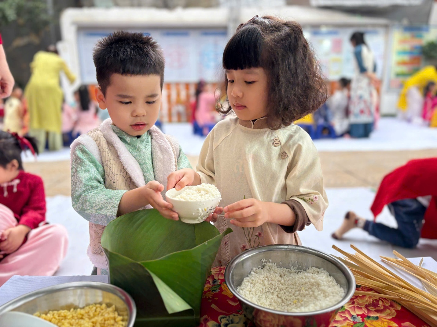 Tiếp nối là Lễ hội Gói bánh chưng – Trải nghiệm Tết cổ truyền được tổ chức vào ngày 06/02/2026. Đây là một hoạt động trải nghiệm vô cùng ý nghĩa đối với trẻ mầm non. Tại đây, các bé được quan sát và trải nghiệm các công đoạn gói bánh chưng. Tìm hiểu về ý nghĩa của bánh chưng trong ngày Tết cổ truyền. Nghe cô giáo giới thiệu về phong tục, tập quán ngày Tết của dân tộc