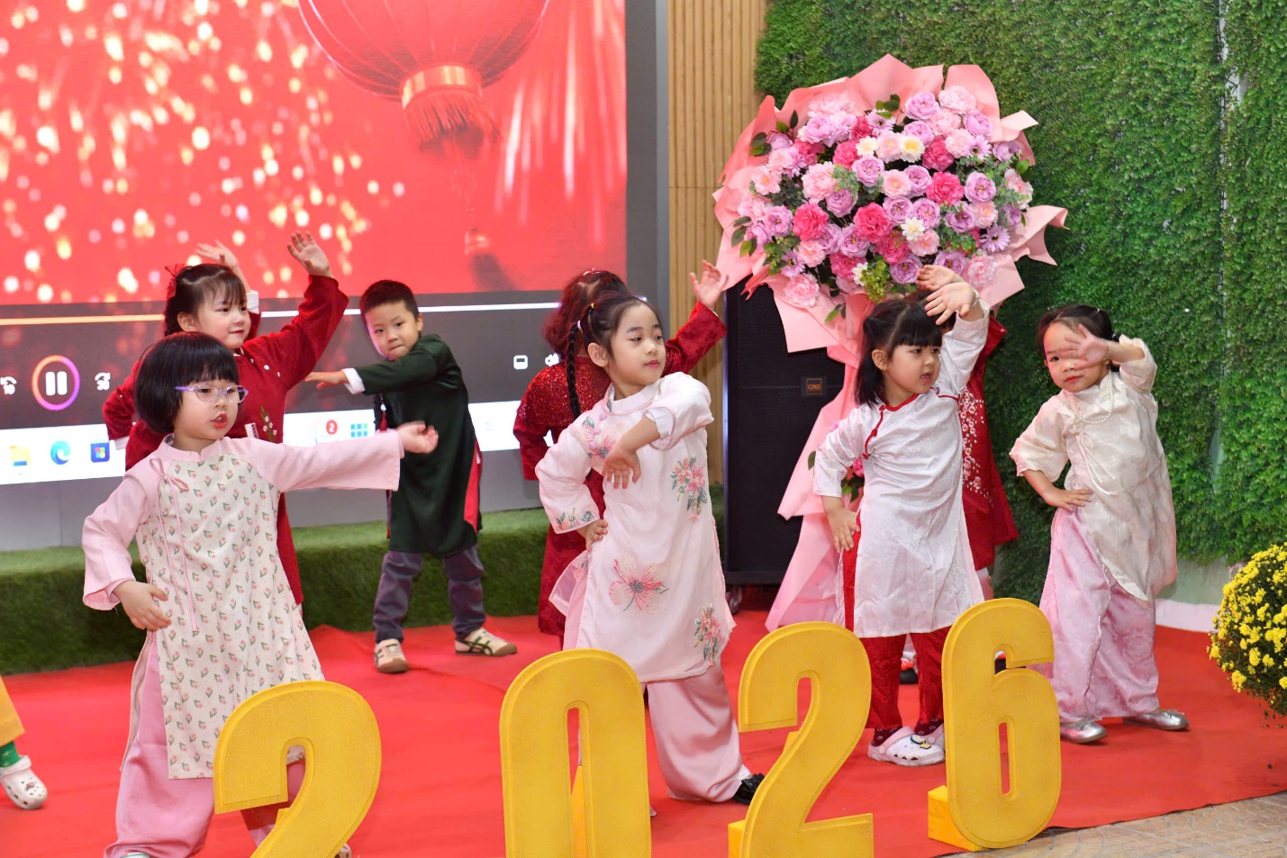 Mở đầu chương trình của chuỗi “ Chào Xuân Bính Ngọ 2026” là: Lễ hội Áo dài – Tôn vinh vẻ đẹp truyền thống. Được tổ chức vào ngày 05/02/2026. Nơi các bé được khoác lên mình những bộ áo dài truyền thống rực rỡ sắc xuân. Trong không khí vui tươi, các con còn được hòa mình vào không gian nghệ thuật với các tiết mục biểu diễn văn nghệ đăch sắc và màn trình diễn áo dài vô cùng tự tin. Đặc biệt, hoạt động múa sạp mang đến những tiếng cười rộn rã và trải nghiệm văn hóa vùng miền độc đáo cho các con.