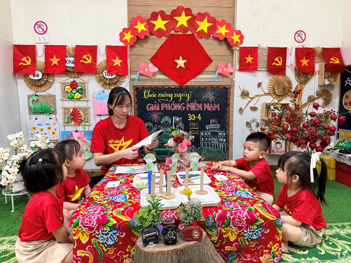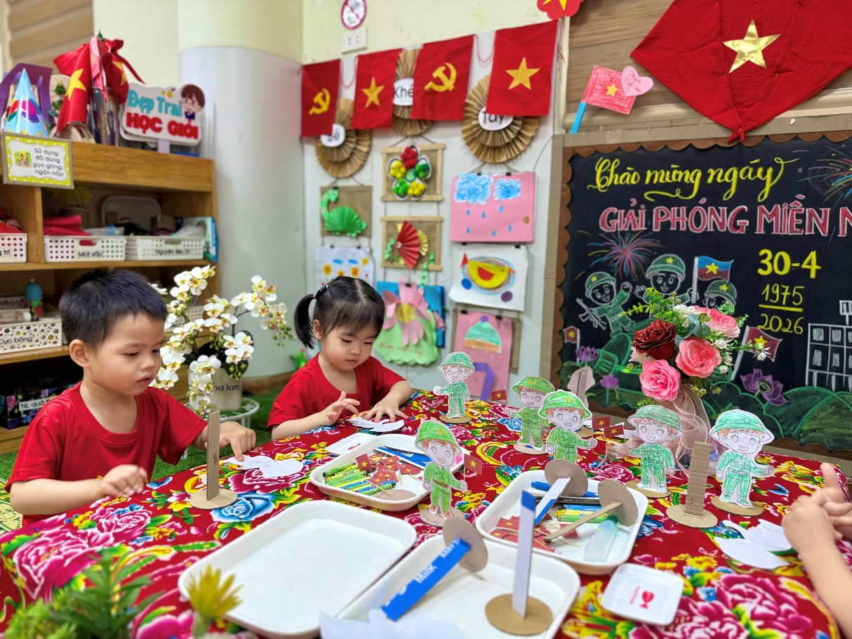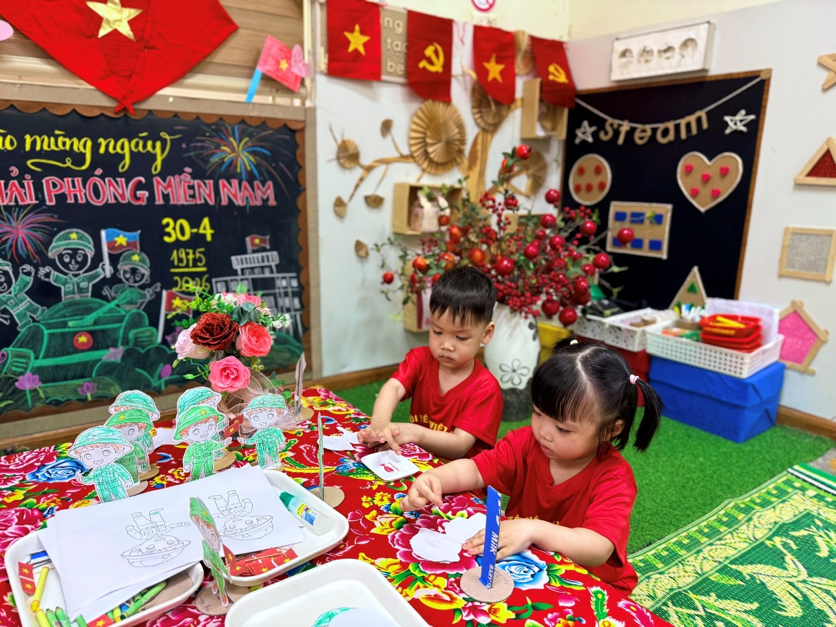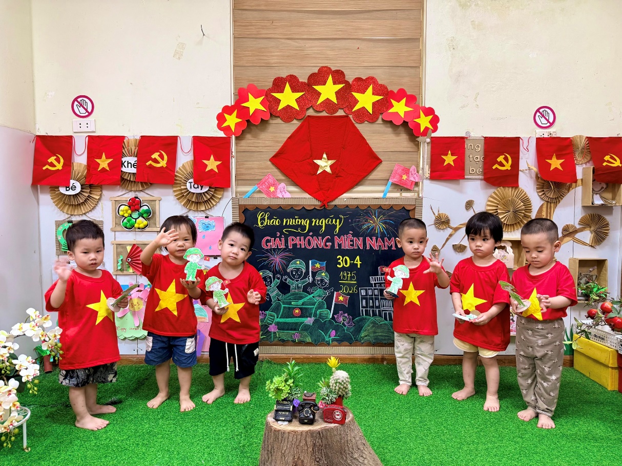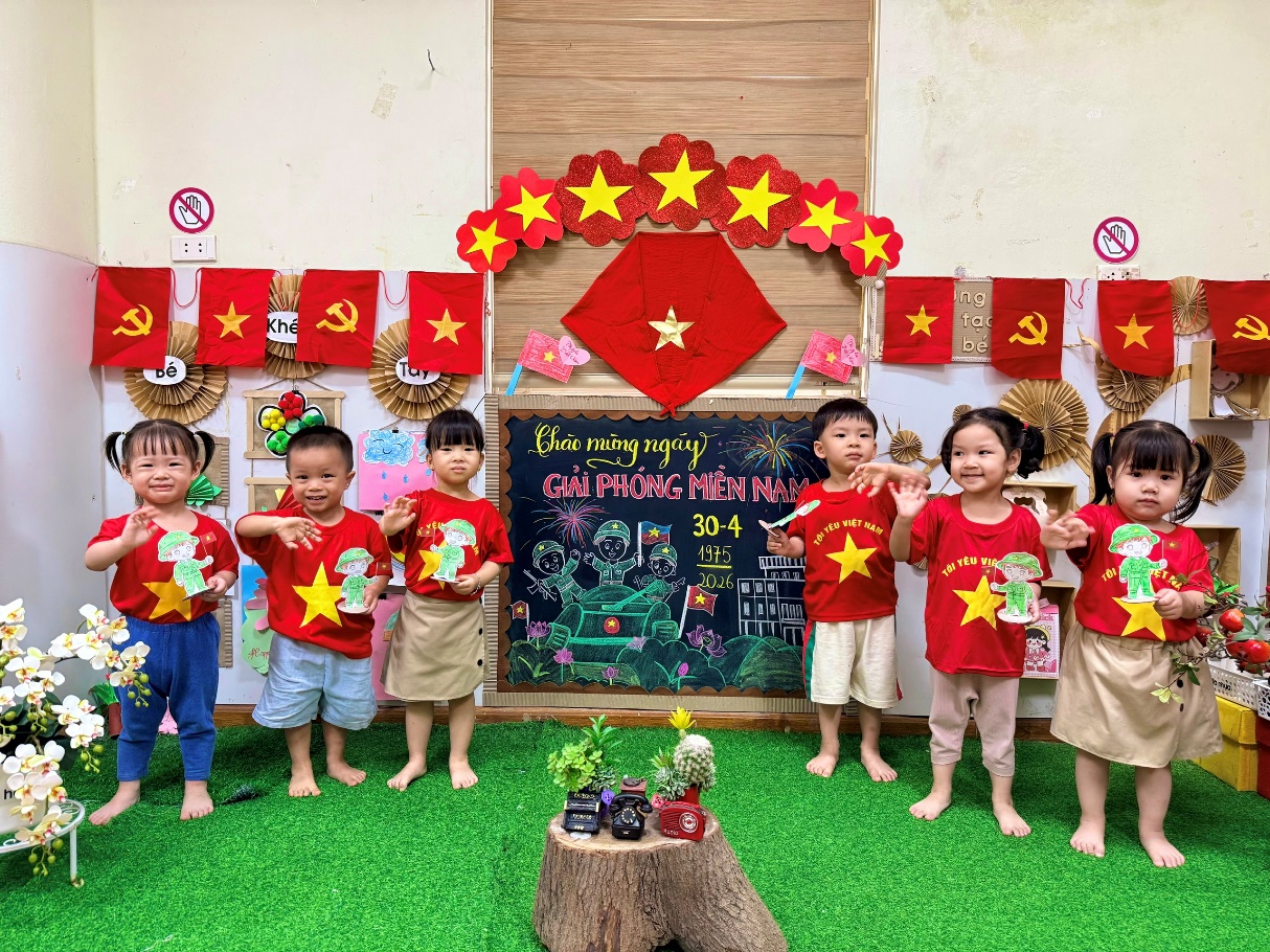 Hòa chung không khí hào hùng của cả nước hướng về kỷ niệm ngày Giải phóng miền Nam, thống nhất đất nước (30/4/1975 - 30/4/2026), các bé lớp D2 đã có một tuần lễ trải nghiệm đầy sắc màu và ý nghĩa. Không chỉ là những bài học lịch sử khô khan, tình yêu quê hương đất nước đã được các cô giáo truyền tải khéo léo qua những đôi bàn tay nhỏ xinh và những nụ cười rạng rỡ.