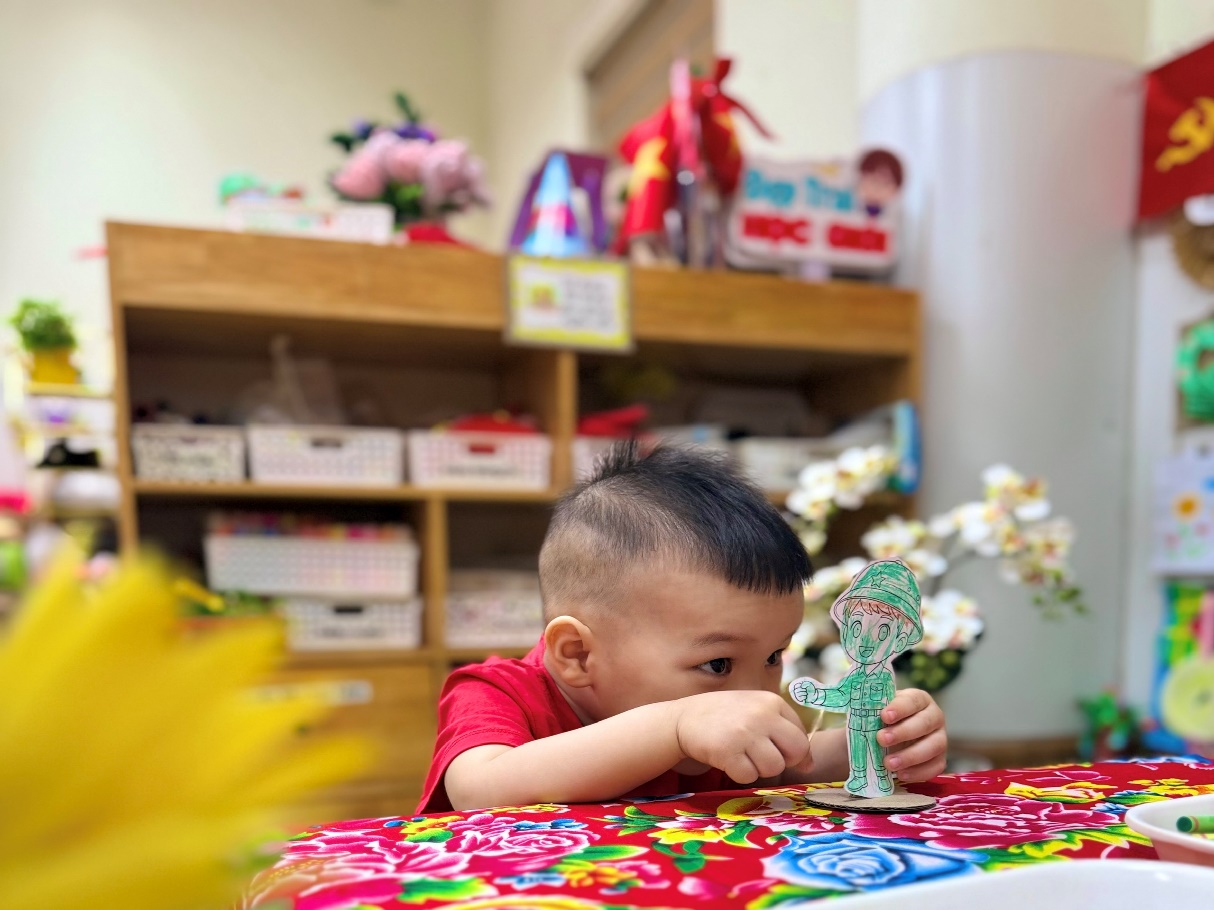 Dưới sự hướng dẫn tận tình của các cô, các bạn nhỏ lớp D2 đã cùng nhau tham gia hoạt động tạo hình đầy thú vị: Tô màu và làm mô hình chú bộ đội.