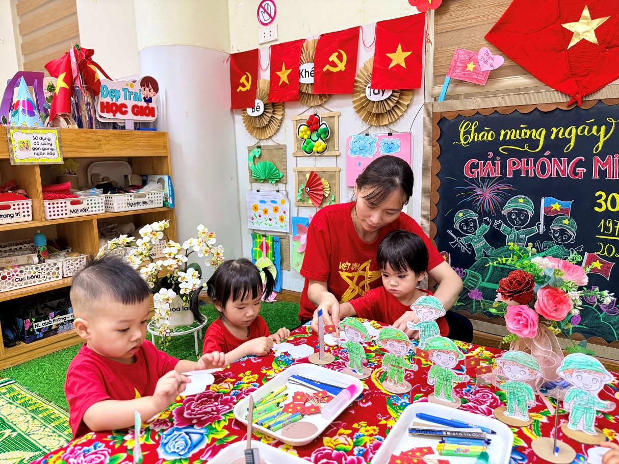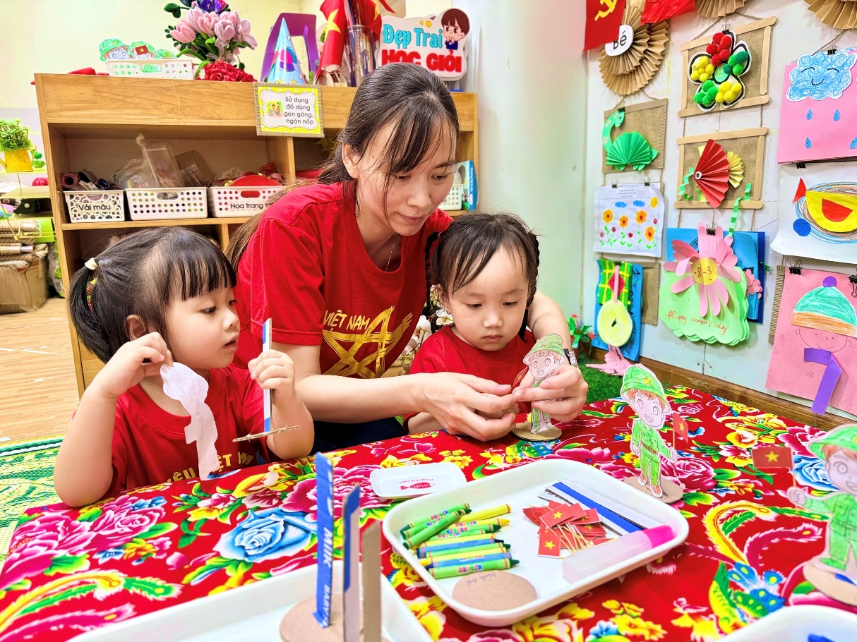 Nhìn những ánh mắt chăm chú của các con khi dán từng lá cờ nhỏ, các cô biết rằng niềm tự hào dân tộc đang dần nảy mầm trong tim mỗi bạn nhỏ.