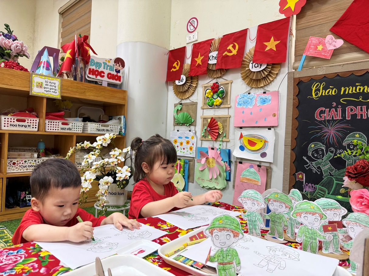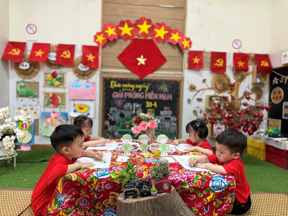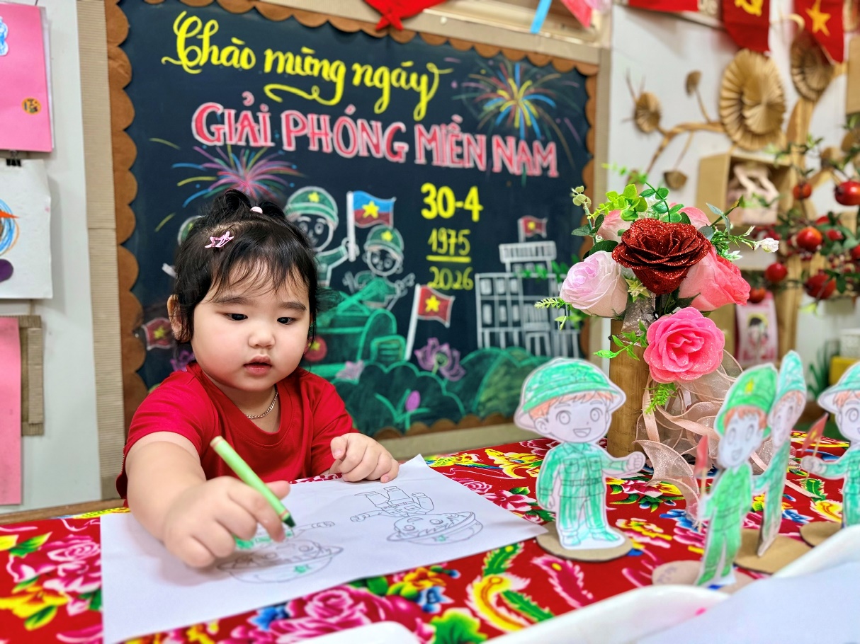Ngay từ những ngày đầu tuần, không gian lớp D2 đã được thay áo mới. Những lá cờ đỏ sao vàng, cờ Đảng cùng những đóa hoa sen rực rỡ được trang trí trang trọng. Điểm nhấn chính là bức tranh bảng phấn cổ động với hình ảnh xe tăng và các chú bộ đội tiến về Dinh độc lập, giúp các con bước đầu làm quen với biểu tượng của ngày đại thắng.