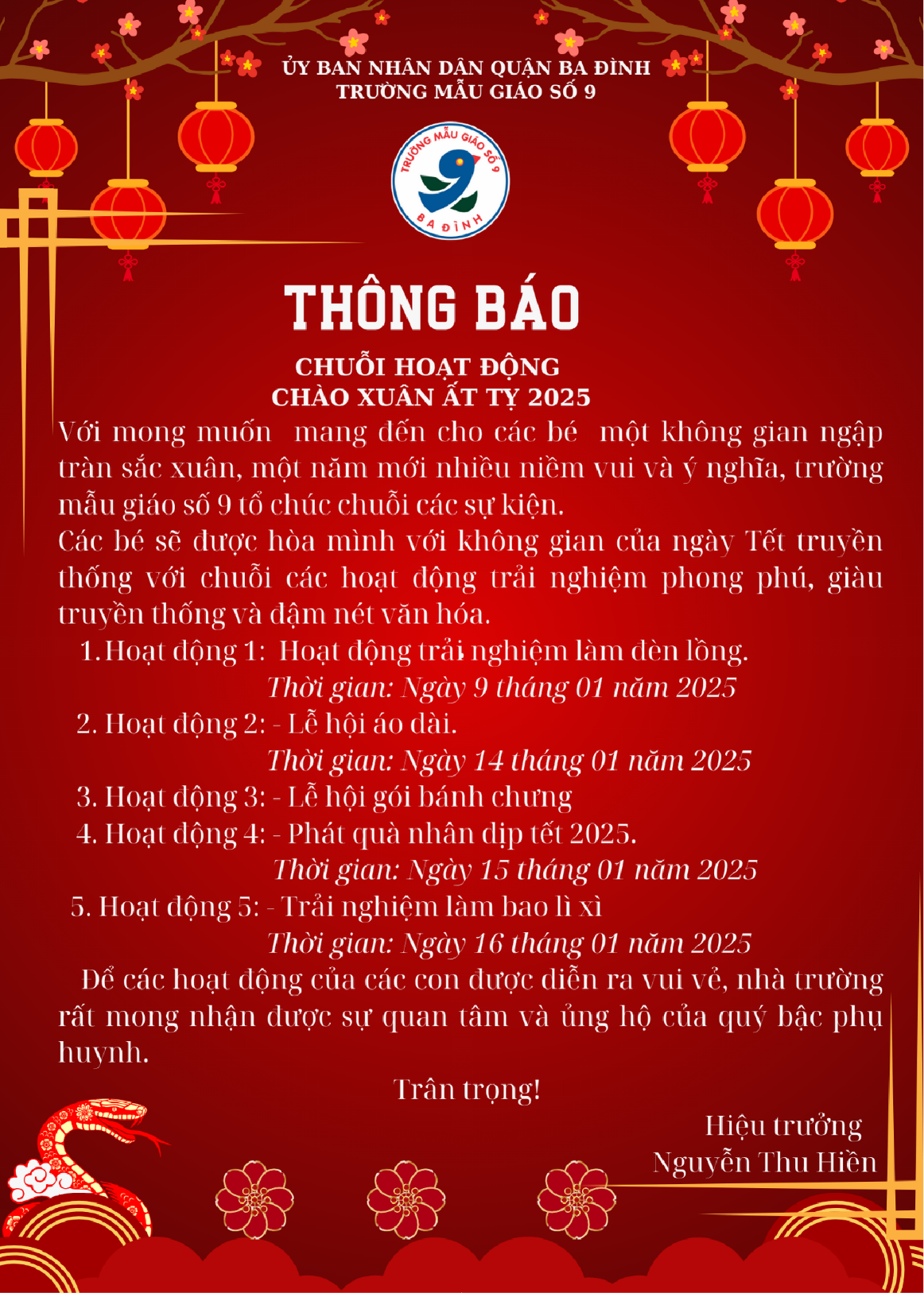 Thông báo về Chuỗi hoạt động Chào xuân Ất Tỵ 2025 của trường Mẫu giáo Số 9. Với mong muốn tạo nên không gian trải nghiệm ý nghĩa, mang đậm nét truyền thống của dân tộc. Chuỗi hoạt động chào xuân diễn ra trong hai tuần đầu tháng 01 năm 2025. Trường Mẫu Giáo số 9 xin trân trọng kính mời quý bậc phụ huynh và các con thân yêu cùng tham gia!