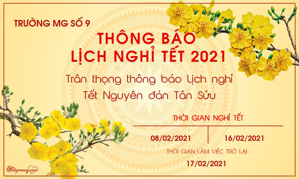Thực hiện công văn số 47/SGDĐT-VP của Sở Giáo dục và Đào tạo Hà Nội ngày 05/01/2021 về việc nghỉ Tết Nguyên đán Tân Sửu năm 2021 ngành GDĐT Hà Nội, trường Mẫu giáo Số 9 thông báo lịch nghỉ Tết 2021 như sau: