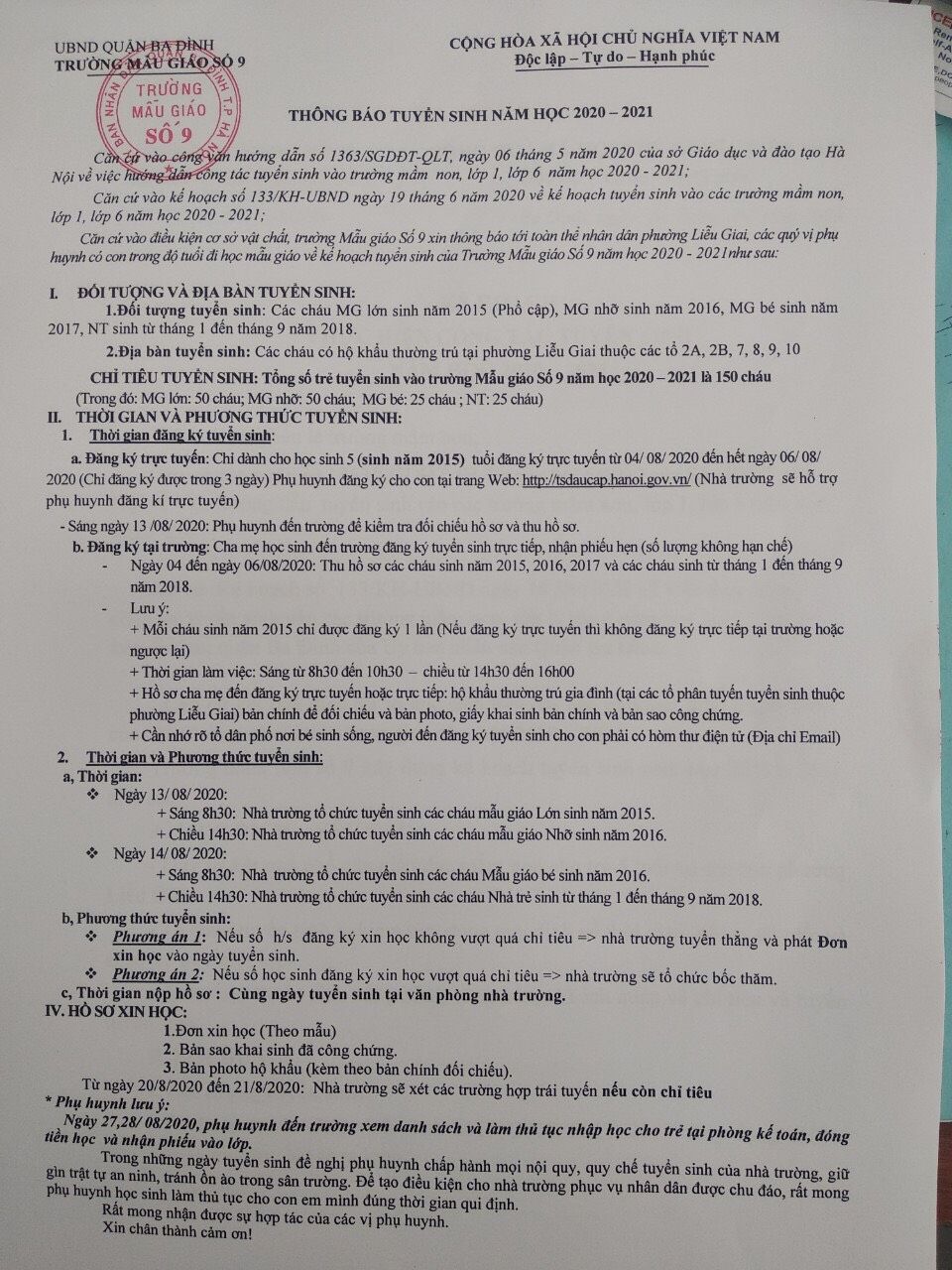 Để các bậc phụ huynh có con trong độ tuổi mầm non địa bàn phường Liễu Giai nắm được các thông tin tuyển sinh năm học 2020-2021, trường Mẫu giáo số 9 gửi bản Thông báo tuyển sinh để thuận tiện cho các bậc phụ huynh theo dõi.