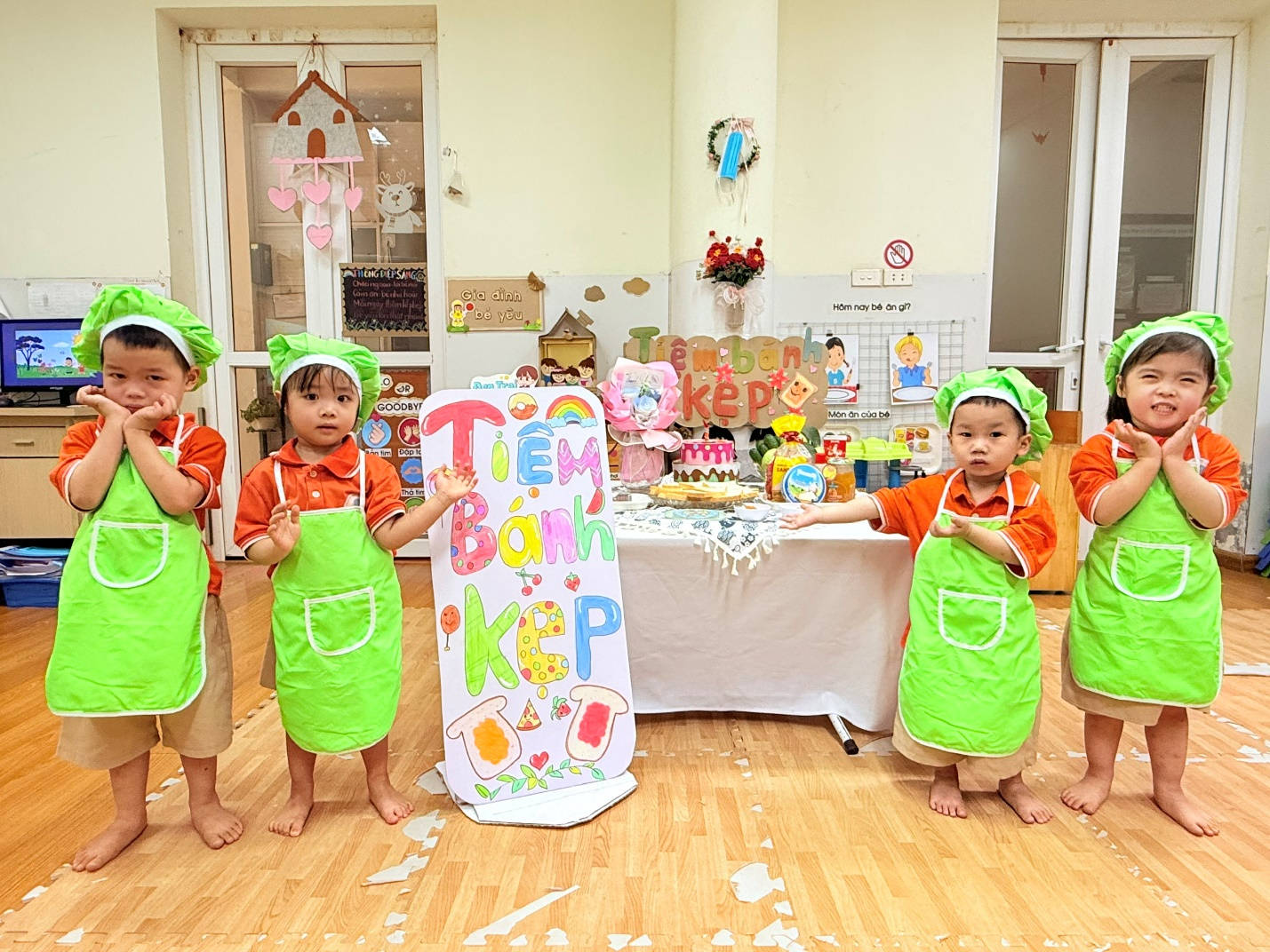 Trong bộ trang phục đầu bếp chuyên nghiệp với chiếc mũ xanh xinh xắn và tạp dề rực rỡ, các bé lớp D2 trông thật chững chạc. Không còn là những cô bé, cậu bé hay nũng nịu, hôm nay các con đã sẵn sàng để trở thành những "nghệ nhân" làm bánh thực thụ.