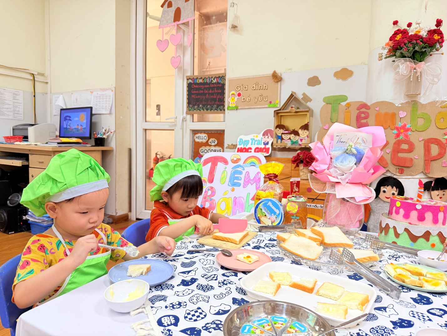 - Trổ tài khéo léo:Từng lát bơ vàng óng, những thìa mứt ngọt ngào được các con phết thật đều tay lên mặt bánh.